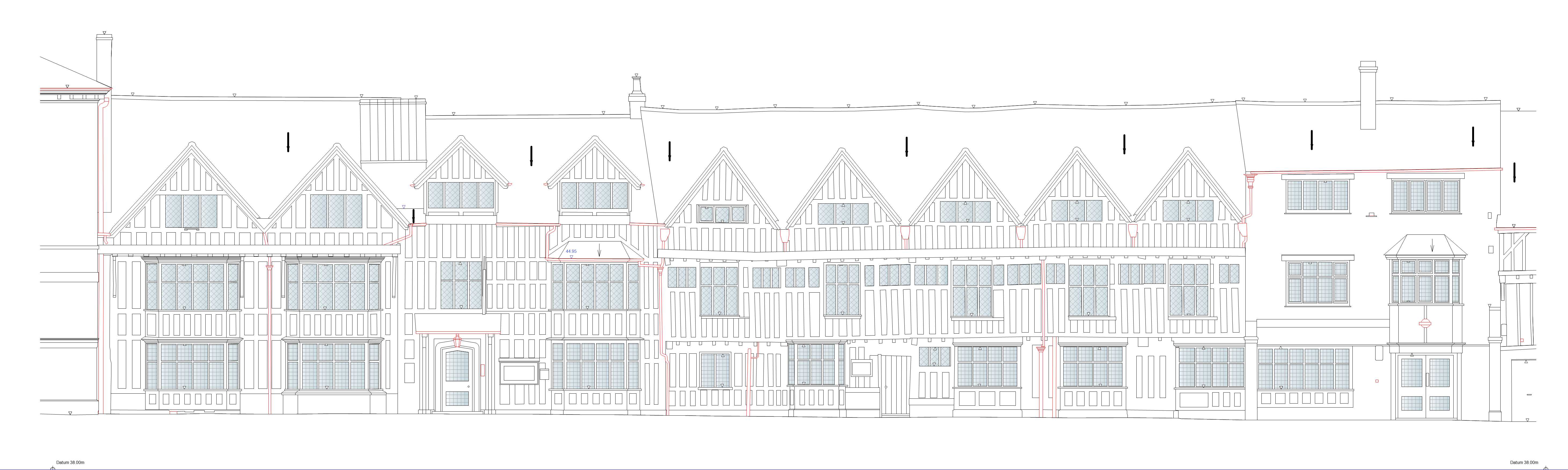 render a picturesque tudor style house with steeply pitched gable roofs dark grey painted tones for the wooden beams and a soft white color for the walls add large decorative windows with glass panes colored in a subtle light blue do not surround the house with lush greenery including vibrant green ivy climbing the walls create a serene and inviting atmosphere with gentle sunlight casting soft shadows on the facade enhancing the textures and details of the architecture the window frame colour matches that of the timber beams the right right building should be brickwork maintain aspect ratio