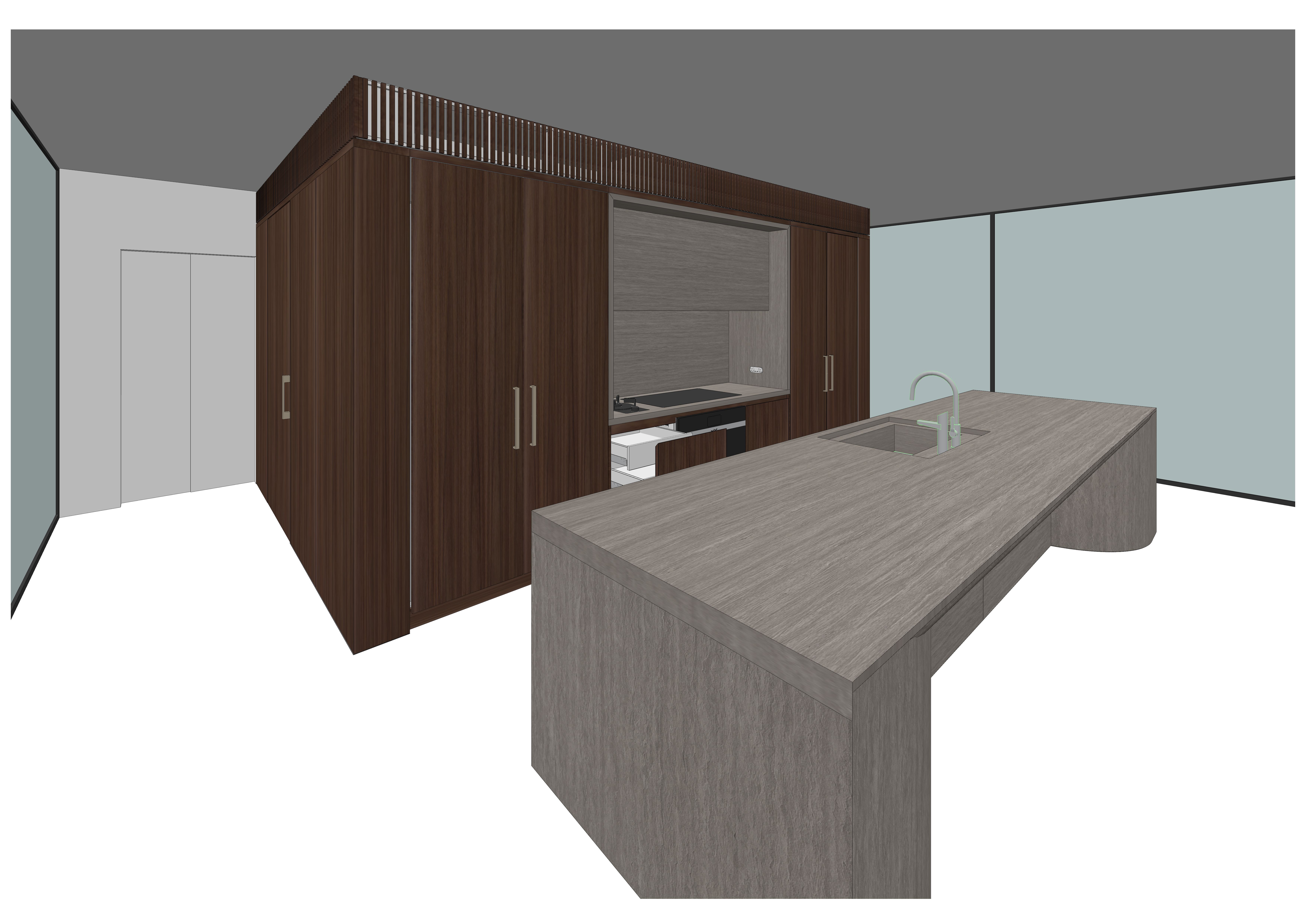 create a high quality render of this image features a massive waterfall island made of antigua gris marble with bold grey veining full height seamless cabinetry in american oak veneer with dark walnut finish with vertical grain matching integrated appliances and matte black fixtures terrazzo flooring with fine aggregate bright natural light from a large floor to ceiling window creates sharp architectural shadows shot on 35mm lens f 8 aperture for deep focus photorealistic 8k resolution v ray style render clean lines ultra modern luxury interior make sure to put a led light underneath the overhead cabinet make the fixtures and appliances realistic dont change the view of the attached image stick to the reference model geometry detailing explicit edge chamfers and bevels avoid razor sharp edges real world materials always have micro rounding consistent real world scale ensure all components are modelled to true dimensions mm preferred layered joinery logic include reveals shadow gaps and panel offsets to reflect actual fabrication methods sink and tap cutouts model these with tolerance gaps and under mount inset logic as per spec handle recesses or mounting plates if applicable show how handles are fixed surface mount vs integrated pull material metadata pbr texture maps include albedo roughness normal and specular maps for timber marble and brass grain direction tags annotate grain flow per panel to enforce grain matching logic reflectivity and gloss levels define per material e g satin brass low gloss polished marble high gloss vein pattern control for marble specify vein direction density and contrast level e g calacatta vs statuario lighting environment hdri environment map use a daylight interior hdri with soft shadows and neutral colour temperature 5000k light source tagging annotate window positions artificial light sources and bounce surfaces shadow softness define penumbra width to avoid harsh cg style shadows styling accessory logic accessory placement zones define styling zones on benchtops with bounding boxes or anchor points accessory material tags e g ceramic bowl linen towel matte soap dispenser clutter threshold specify max number of accessories per zone to preserve minimalist intent camera composition guidance preferred angles e g 35mm lens equivalent eye level or slightly above 3 4 perspective focal depth annotate key focal planes e g sink edge handle line to guide depth of field framing logic define crop boundaries to avoid cutting off key joinery or material transitions