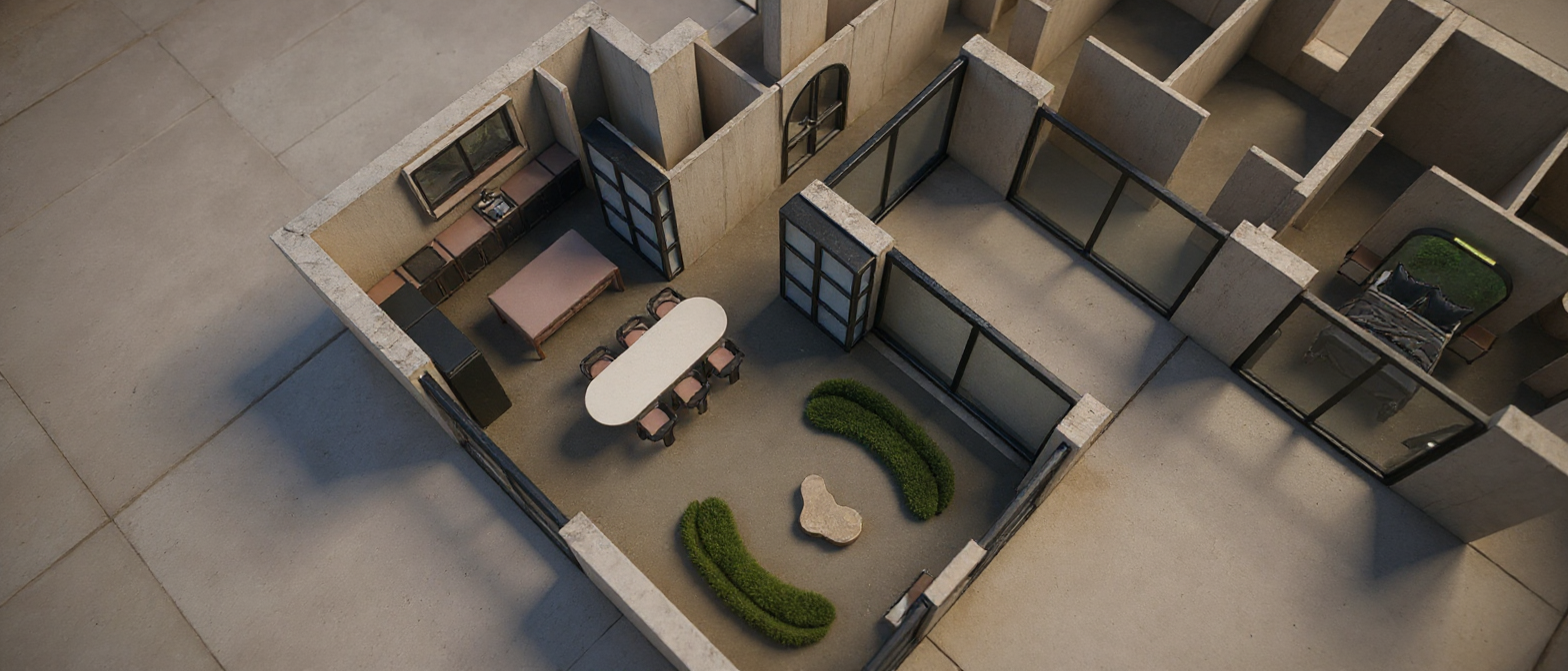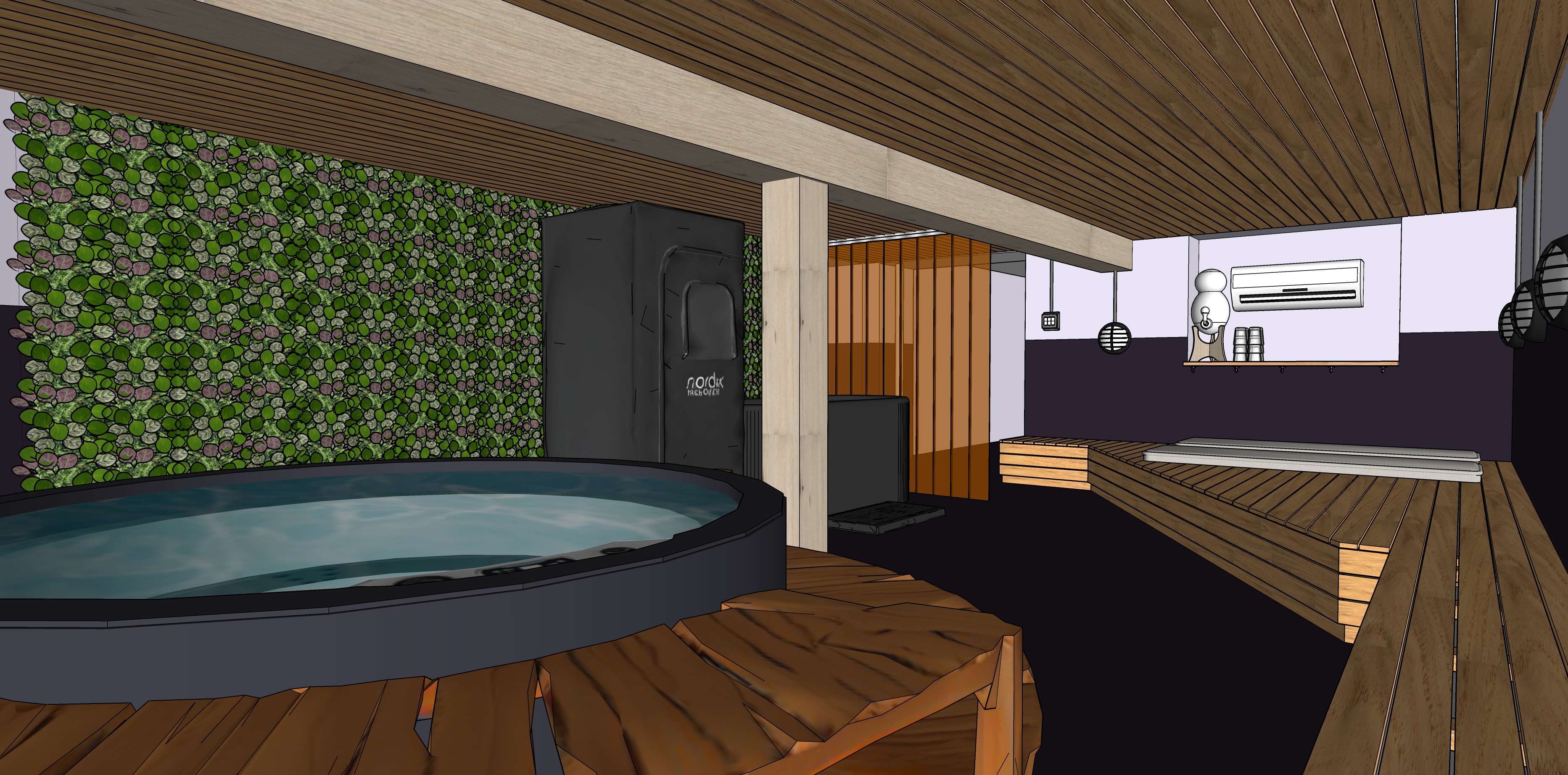 do not change the colors materials finish keep the viewing angle turn on the wall lights it is a basement without windows but still bright ambiance with dim lighting the floor is painted dark purple concrete the bottom of the dry walls are dark purple but the top of the walls is white with a very little tint of lavender colored the curtain is made of frosted amber plastic slats the ceiling and the benches are made of wood dried construction spruce light wood lumber the cushions on the benches are made of linen the structure around the spa is made of wooden slats the exterior of the spa is a dark gray make a light under the wood bench create a little smoke coming from the spa