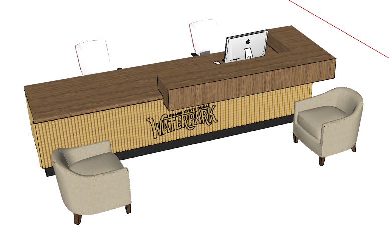 render a modern reception area with a warm and welcoming atmosphere the desk should have a light oak wood texture with a light bamboo panel front the desk features a sleek metallic edging for a contemporary touch two plush armchairs with a soft linen fabric in a natural ivory color are placed on either side the backdrop is a subtle light gray with gentle ambient lighting to create a cozy environment a sleek modern computer monitor is on the desk use warm natural tones to enhance the inviting ambiance