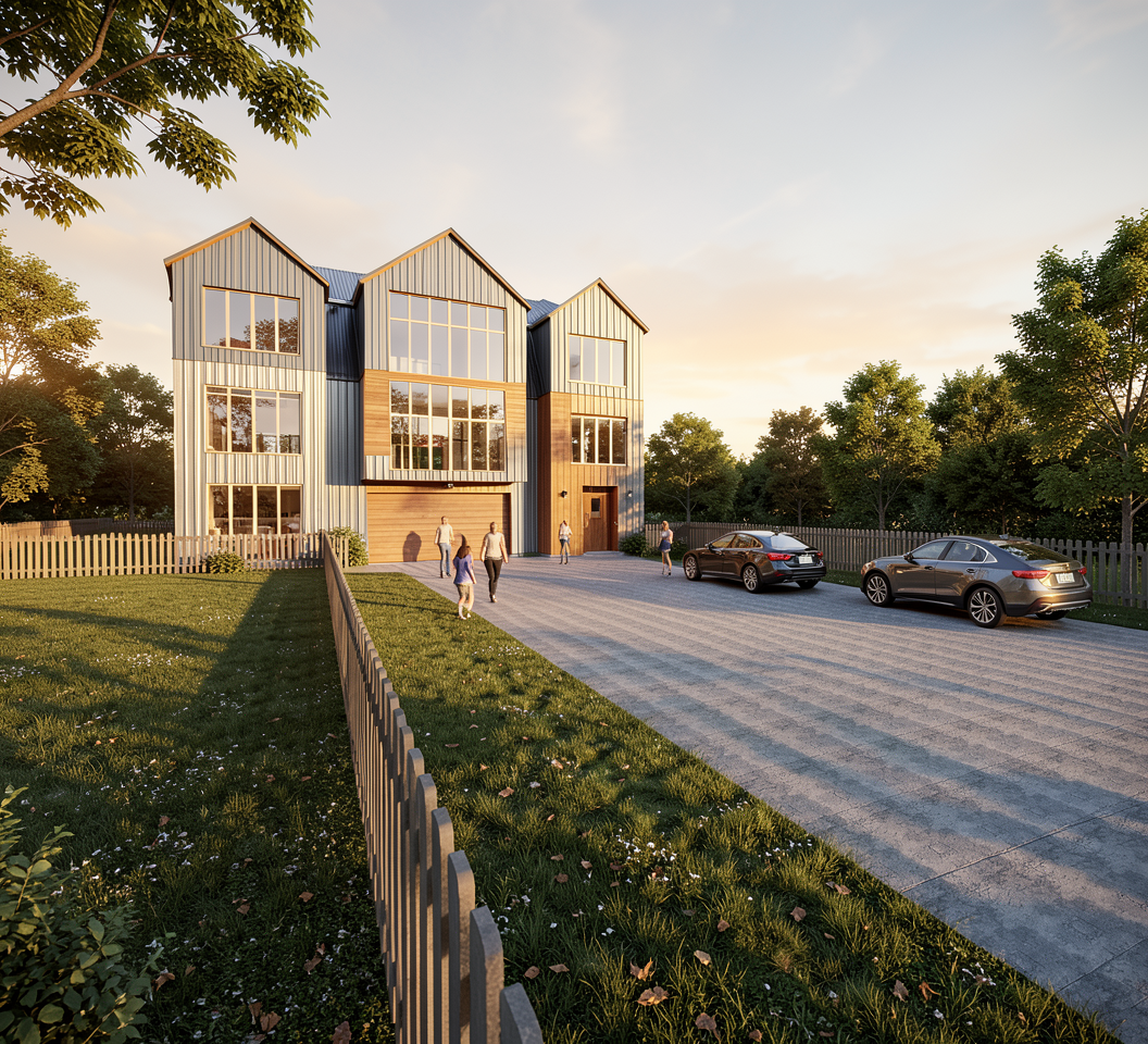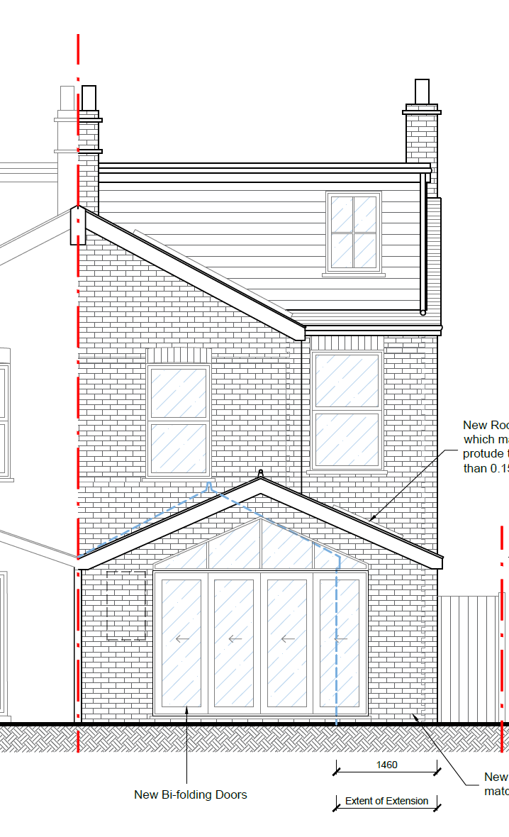create a realistic architectural visualisation based exactly on this rear elevation drawing strict spatial rules single storey rear extension only extension projects 1 46 metres beyond the original rear wall the projection must appear modest and shallow the extension ridge height is lower than the main house eaves maintain the existing first floor exactly as drawn do not alter chimney positions or roofline maintain exact window and door proportions architectural style traditional uk london stock brick with natural tonal variation subtle red brick lintels and banding to match existing dark grey slate roof tiles to extension gable black aluminium bi fold doors black fascia soffits and rainwater goods realistic mortar colour and brick coursing slightly overcast british daylight design clarity the extension must read as a small sympathetic addition preserve correct wall thickness preserve original house massing keep the gable proportion exactly as drawn do not redesign or modernise beyond the drawing