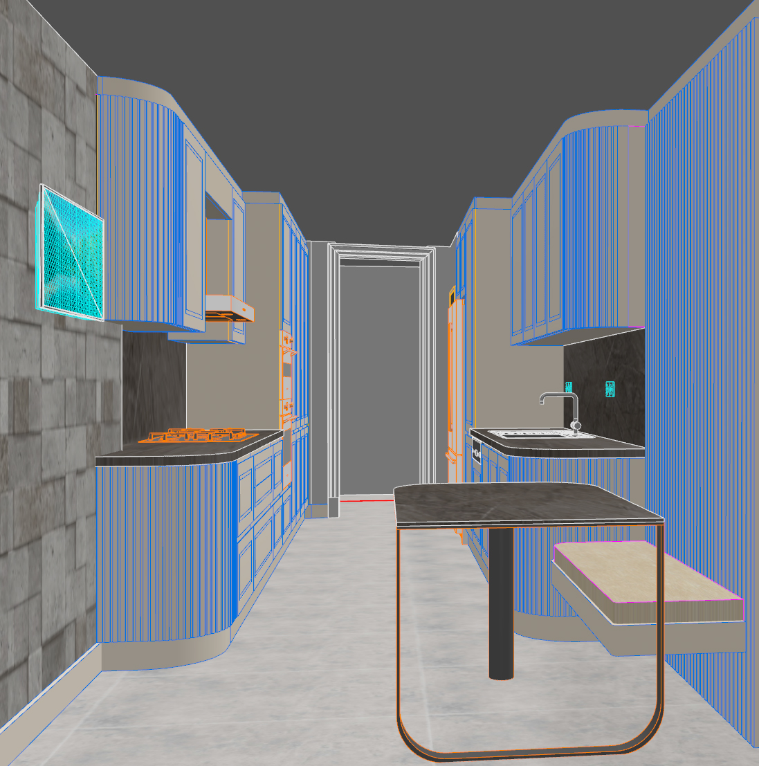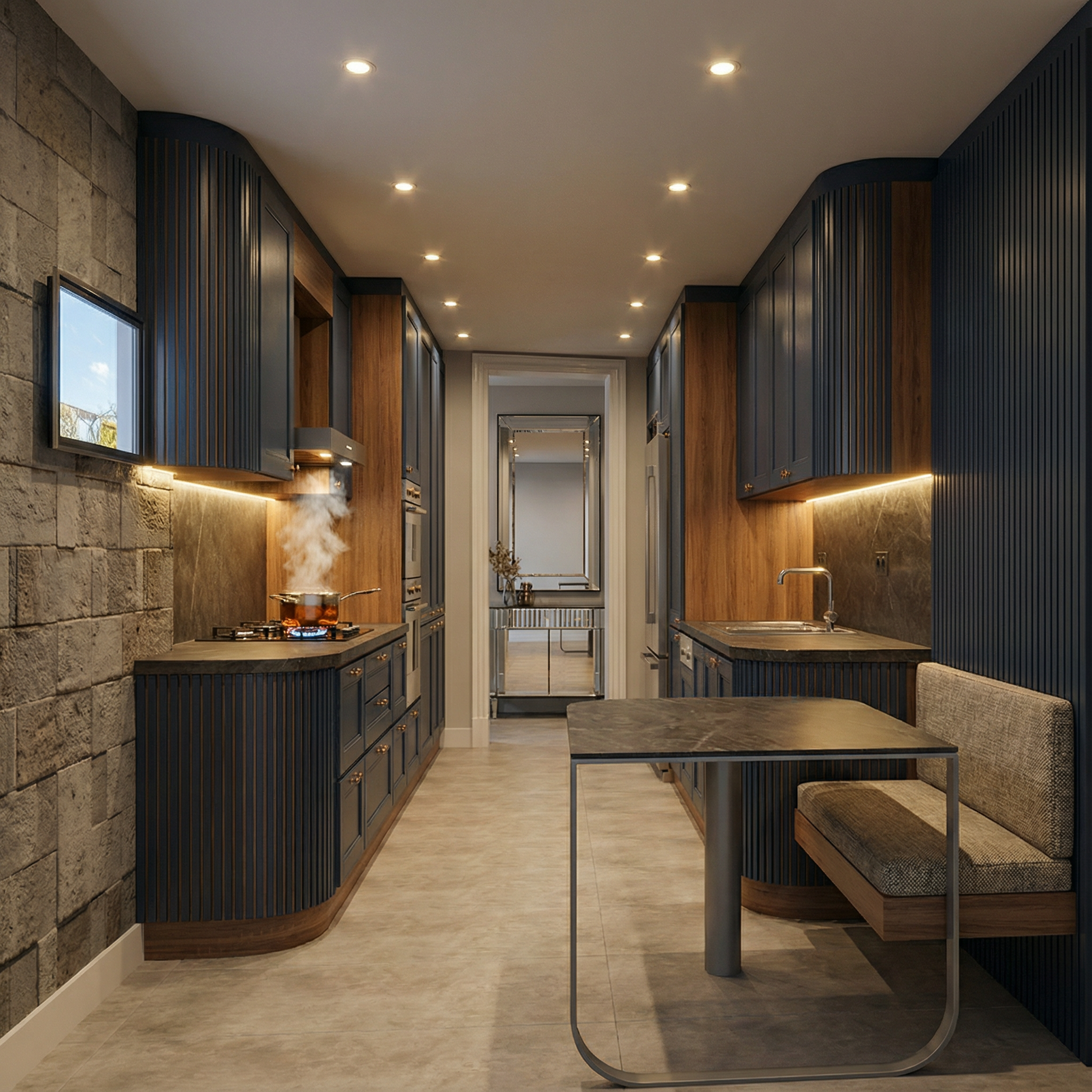 there should be spot lighting on the ceiling there should be led lighting under the upper cabinets tea should be brewed on the stove there should be a mirrored sideboard behind the door the floor should be ceramic the table surface and the countertop should remain the same the cabinet door model should remain the same the color of the cabinet doors should be beige the seating area should remain the same the seating area should have fabric upholstery the table legs should be metal