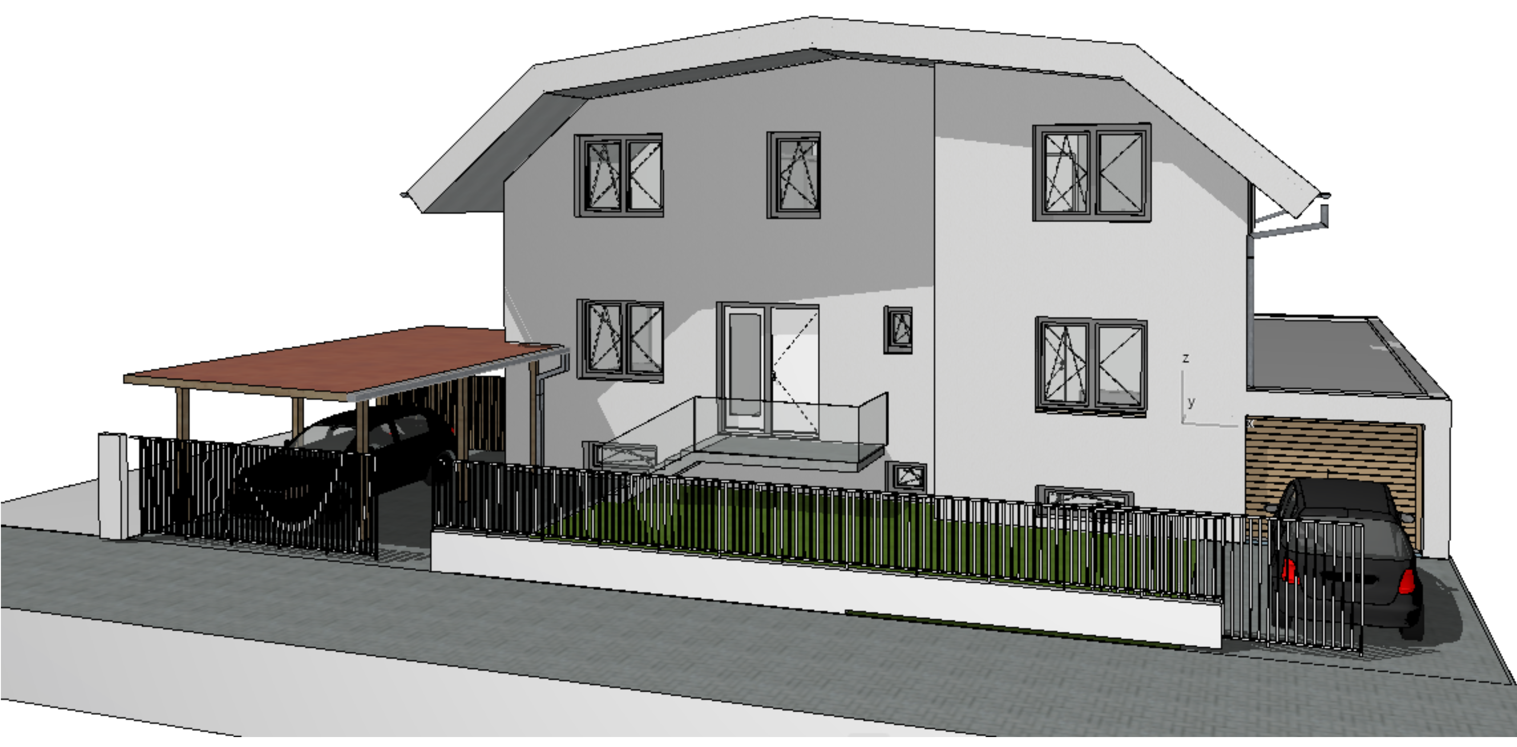 modern exterior shot roof grey fassade white with grey elements window frame grey roof carport grey garage door grey architecture