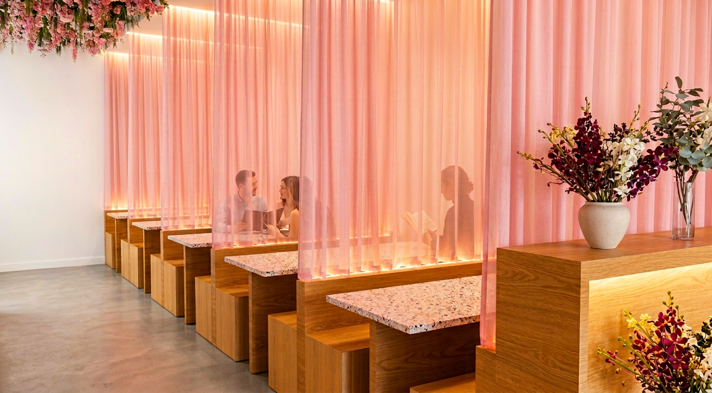 a luxurious hotel rooftop lounge bar interior same layout and perspective as reference image replace existing furniture with new styles high bar stools replaced with elegant ribbed velvet bar chairs in deep emerald green with brushed gold metal legs and footrest round bar height tables replaced with smoked glass tops on matte black sculptural bases teal blue lounge sofas replaced with curved low profile sectional sofas in warm camel cognac premium leather with solid walnut wooden legs round lounge tables replaced with travertine stone tops on geometric brass frames maintain exact same furniture quantity and spatial positioning keep the large floor to ceiling panoramic windows with hong kong city skyline view preserve the travertine limestone textured wall on the left retain the ink painting artwork on the glass partition in background keep the glossy cream marble tile flooring keep the outdoor terrace visible through windows same bright natural daylight blue sky city and mountain backdrop photorealistic luxury interior design photography 8k resolution