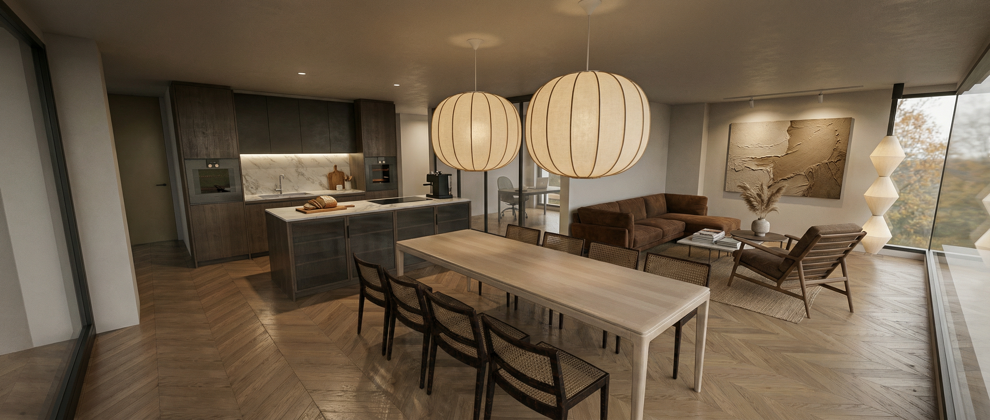 walls and flooring are in off white microcement add books in the library