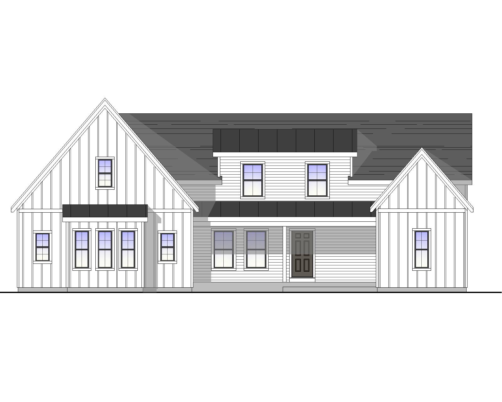 a beautiful serene farmhouse with a charming atmosphere the exterior features white siding with soft gray accents complemented by dark charcoal roofing add soft lavender window frames to enhance the quaint look the front door is a bold deep brown to provide a warm welcome surround the house with lush greenery and create a peaceful setting with a soft warm sunset sky in gentle shades of orange and pink casting a golden glow over the scene