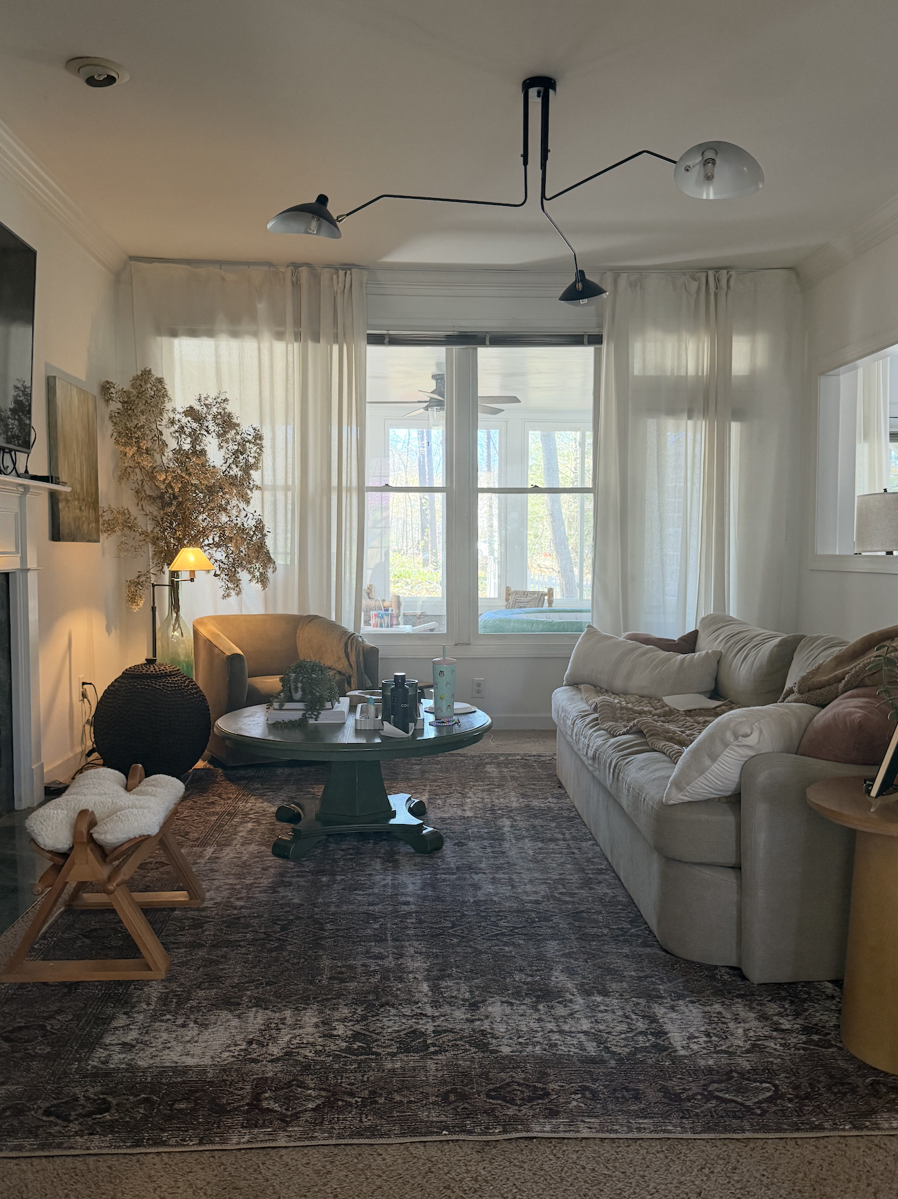 change lighting to linen round pendant light wood coffee table taupe shades behind sand drapery