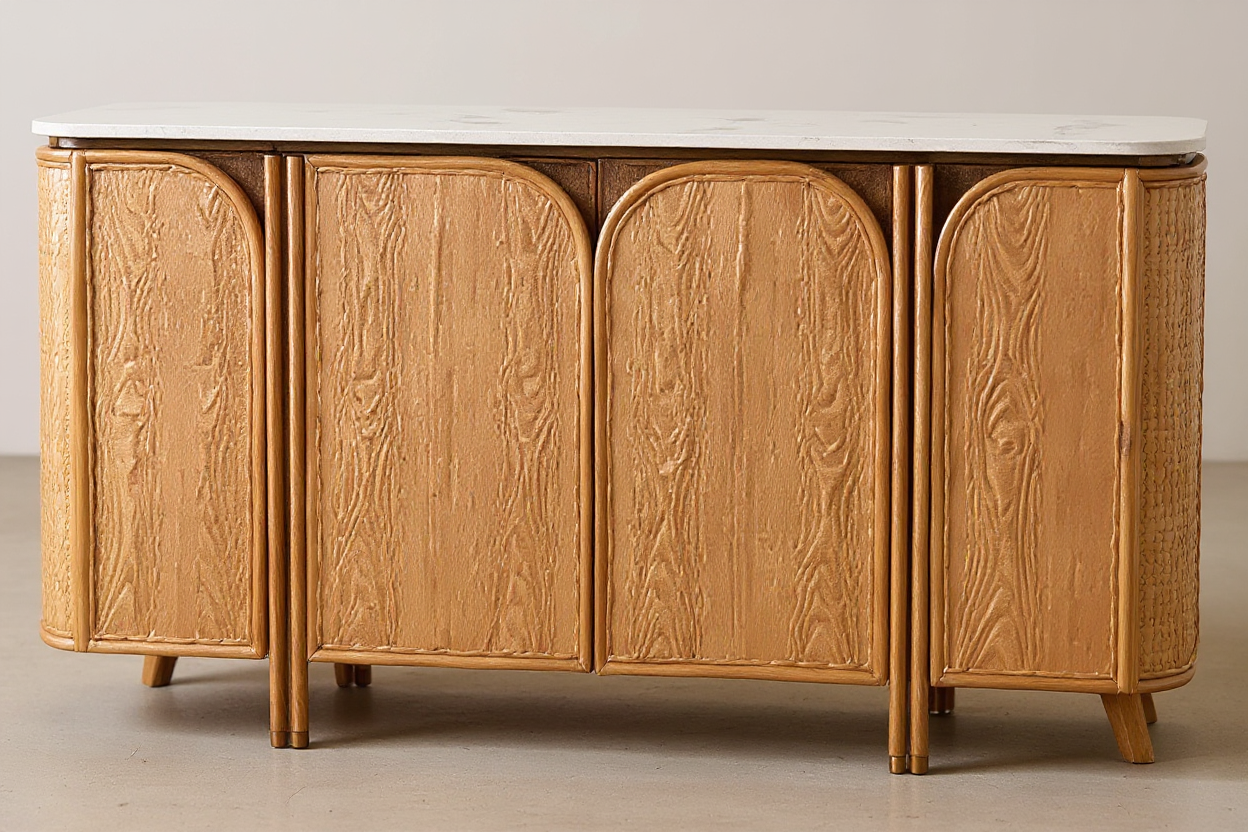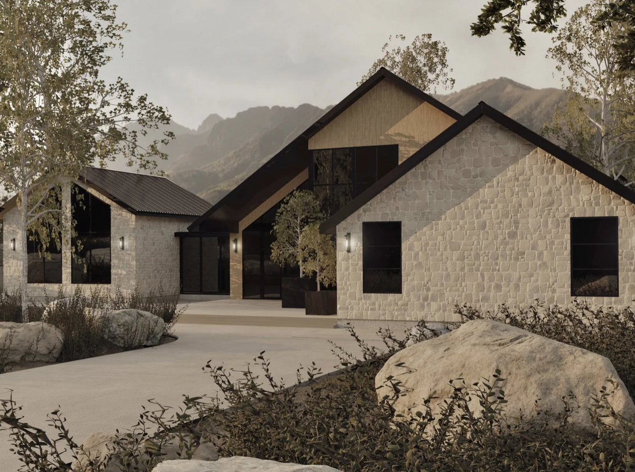 rganic modern barn style exterior front facade render in a new zealand rural setting with the specifications you provided two pitched gables one clad in light stone the other clad in light teak timber with black large pane window frames and a black roof architecture