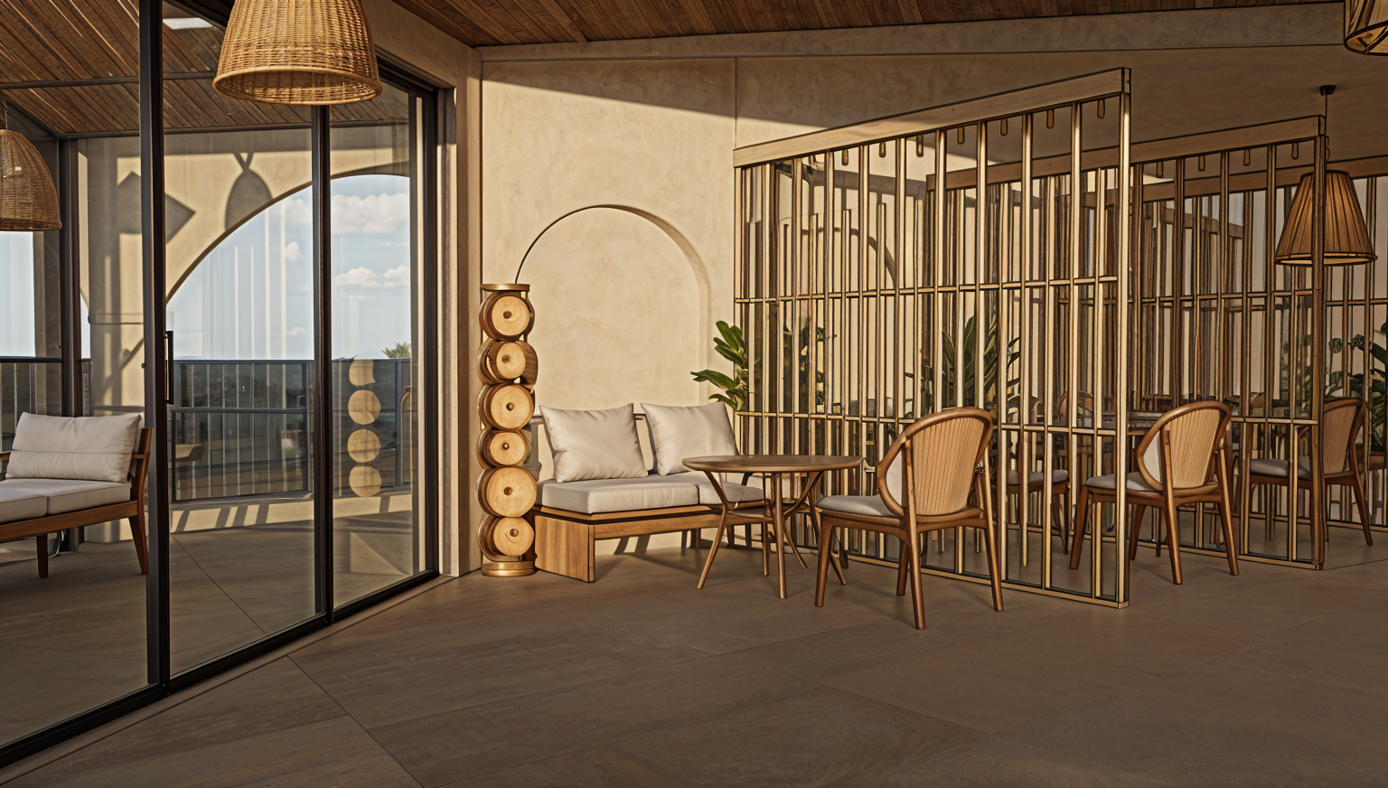 a caf and hookah lounge in djibouti asta studio maintain the original design exactly only enhance with realistic ambient lighting the architecture reflects asta studio s minimal and warm east african aesthetic using soft neutral tones earth textures and natural materials the space combines modern simplicity with regional craftsmanship arched openings tadelakt plaster walls wood and rattan furniture and terracotta flooring include subtle greenery and woven details that evoke a relaxed coastal desert atmosphere lighting style realistic warm ambient glow use soft indirect daylight during late afternoon and gentle golden lighting for indoor ambience diffused pendant lights recessed floor lamps and reflections from textured walls capture a calm atmospheric mood that feels authentic to djibouti s climate and light quality the final model should preserve every spatial element and proportion of the original design no changes to structure layout or materials only an enhancement of lighting realism depth and mood architecture