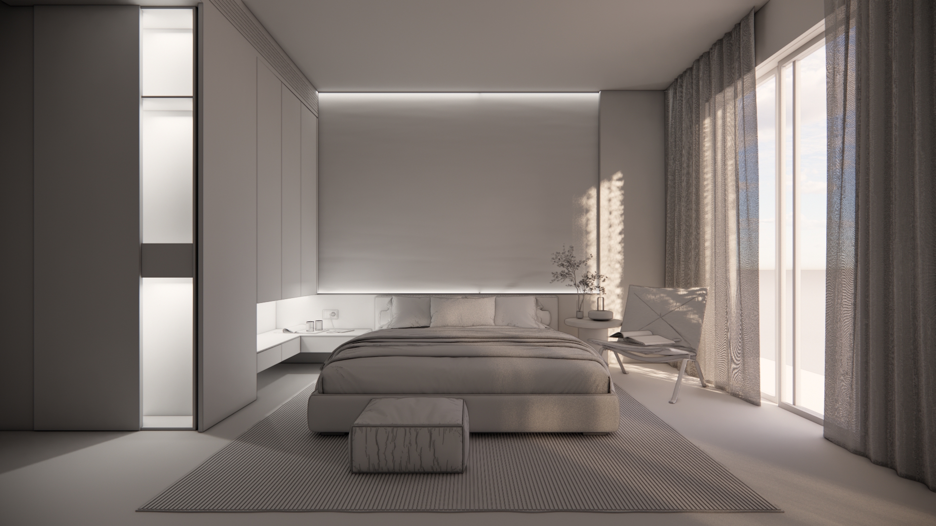 interior shot render a modern minimalist bedroom with soft neutral tones the walls are a warm cream and the floor is a light oak wood the bed features a luxurious grey duvet and matching pillows set against a white tufted headboard the bedside tables are white with sleek design accessorized with a small vase of lavender the curtains are sheer in a soft beige allowing a warm golden sunlight to stream in casting gentle shadows the atmosphere is serene and calming a perfect balance of elegance and simplicity