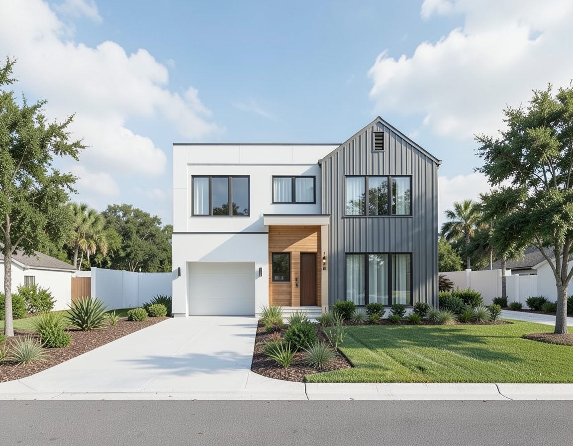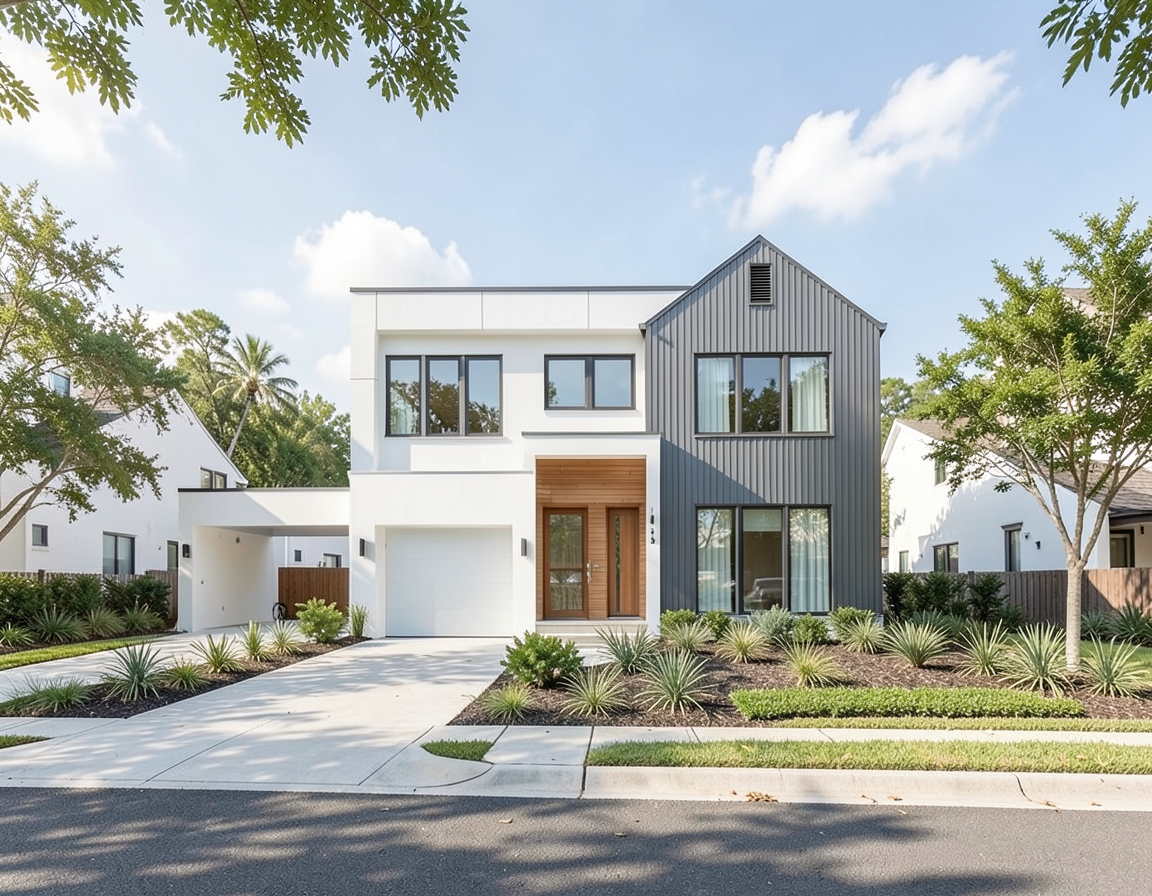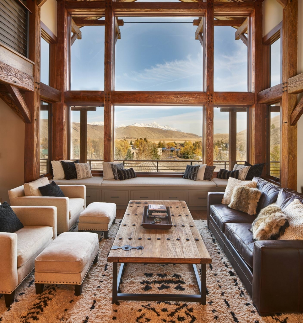a rustic elegant mountain lodge nestled among lush greenery and rocky landscape the house features a modern design with a warm cozy atmosphere constructed with a dark wooden frame and beautiful stonework in shades of earthy brown and gray the roof displays a cool slate color blending harmoniously with the surrounding mountainous backdrop in calming shades of green and muted blue the sky is a crisp twilight creating a serene and inviting ambiance with soft ambient lighting emanating from within the lodge casting a gentle golden glow the landscape includes well manicured emerald green grass accentuated by natural stone pathways and scattered boulders in soft tan and rose hues