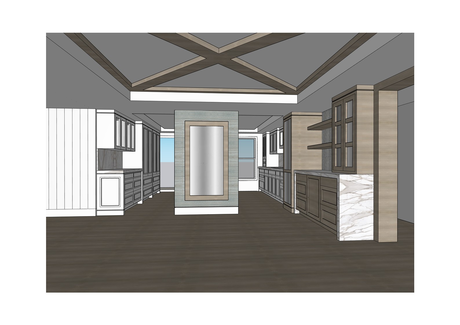 transform the provided elevation into a hyper realistic interior photograph that is indistinguishable from a real professionally shot interior design photograph this must read as a real space captured by a camera not a rendering not a visualization not architectural cg not concept art and not an illustration geometry lock non negotiable preserve the exact original geometry layout proportions ceiling details wall depths panel divisions openings doors cabinetry locations millwork dimensions built ins and circulation paths with zero architectural changes nothing may move scale simplify or be reinterpreted geometry must remain absolutely unchanged camera derivation critical derive the camera position height angle and framing strictly from the uploaded elevation eye level interior photography centered or naturally balanced composition 24 35mm interior lens feel no dramatic angles no stylized framing do not reuse or approximate camera framing from any previous image remove all drawing artifacts completely remove all linework cad edges drafting outlines diagrammatic shapes sketch artifacts nothing may appear outlined flat schematic or illustrative the elevation must be visually reinterpreted as a finished real interior photograph material realism rules wood if present smooth solid plank material extremely subtle restrained grain matte or soft satin finish only no graphic patterns no decorative striping no visual noise wood must absorb light gently never glossy or sharp fabric upholstery if present soft compression subtle seams gentle shadowing natural fabric texture no flat color blocks stone slabs if present light natural veining soft organic variation low contrast no symmetry no bold or busy patterns stone must feel heavy and grounded walls fine surface texture slight tonal variation never flat paint edge construction realism all edges corners joints and transitions must be softly broken and physically realistic no razor sharp corners no cgi perfect edges slight construction tolerances only everything must read as fabricated installed and dimensional lighting photographic behavior lighting must behave like real high end interior photography natural daylight only unless otherwise specified realistic light bounce gentle shadow falloff uneven exposure distribution subtle brightness variation across surfaces avoid studio lighting uniform illumination over clean exposure global illumination look slight softness is preferred over sharpness camera image imperfections very important introduce subtle photographic characteristics gentle lens softness micro exposure variation natural contrast roll off mild atmospheric depth primary plane sharp background slightly softer the image must feel captured not generated absolute constraints no creative interpretation no stylization no exaggeration no added or removed elements any deviation from the original elevation geometry or intent is unacceptable negative prompt always include architectural rendering 3d visualization cgi unreal engine octane vray sketchup look flat textures graphic lines outlined edges over sharpened studio lighting concept art illustration ai look plastic materials glossy wood high contrast grain perfect symmetry keep design as shown in the picture