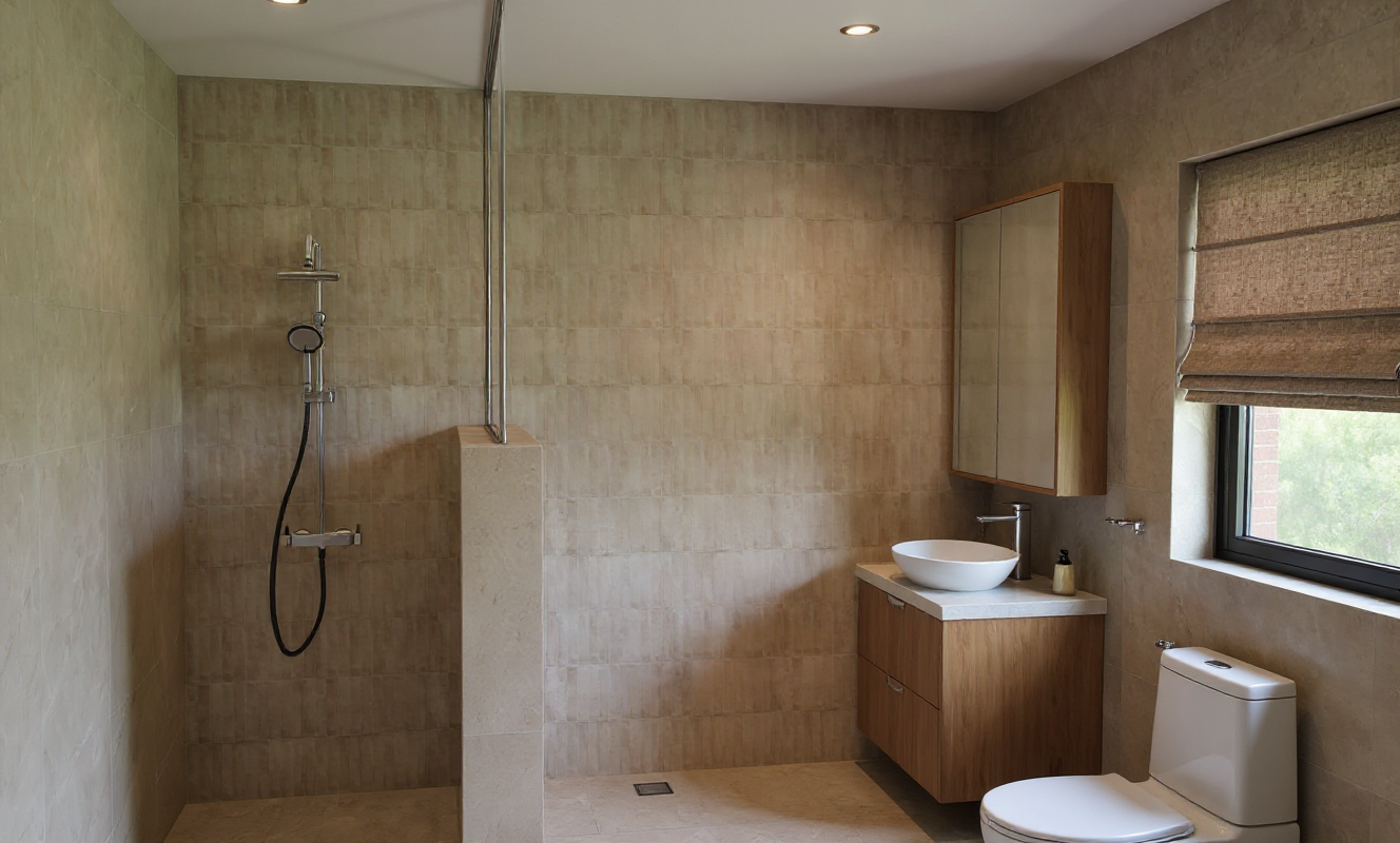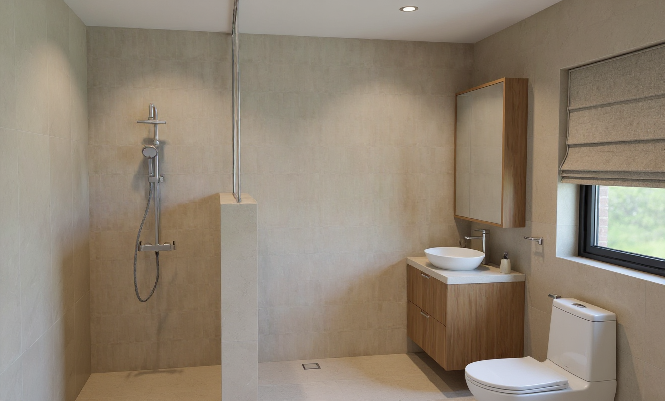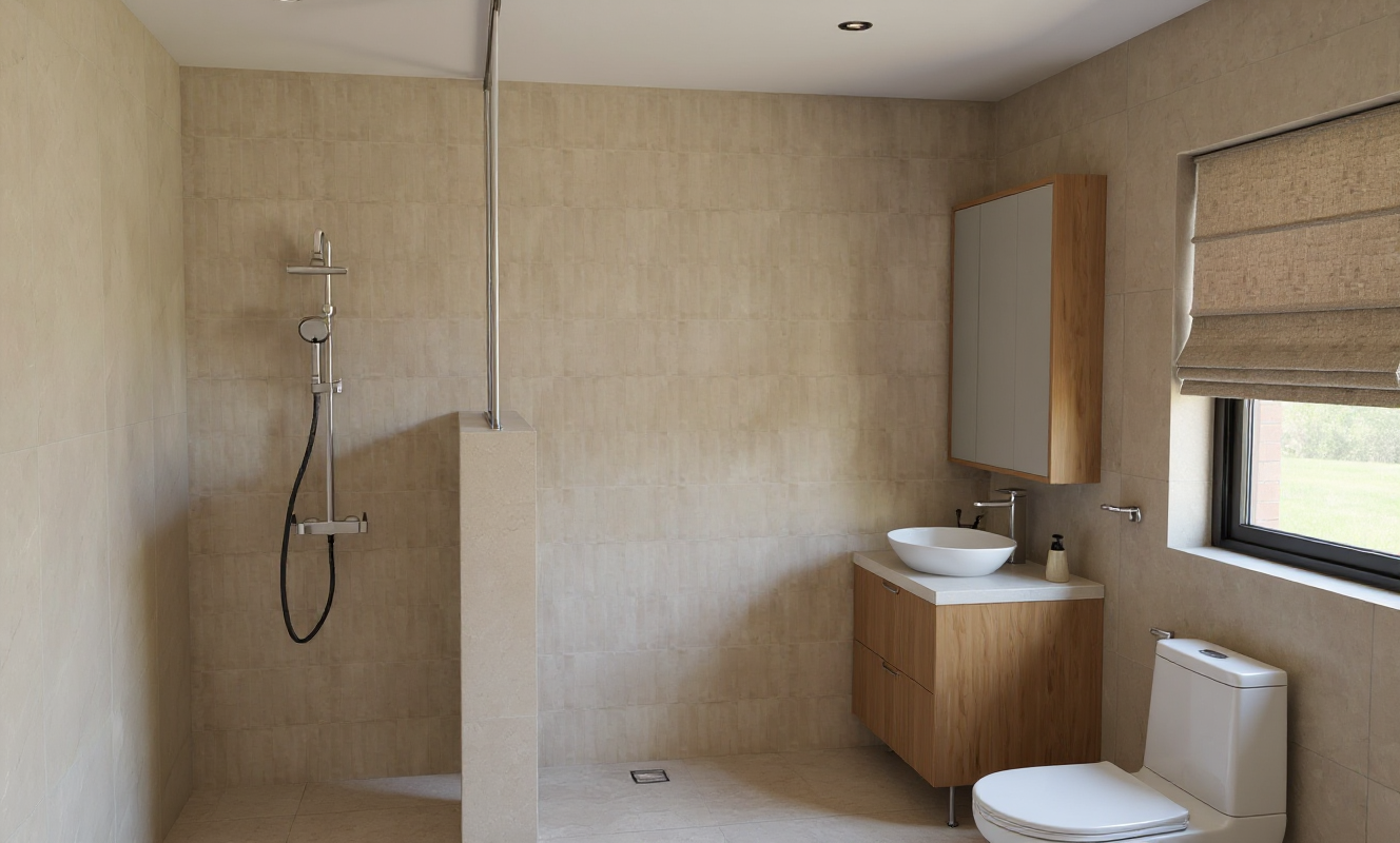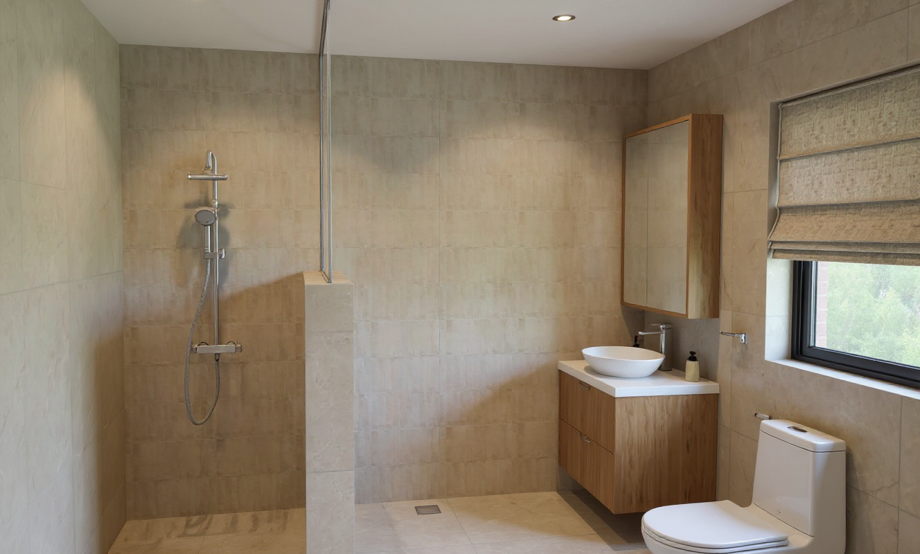 lower contrast lighter beige tone floor and wall tiles matt finishing morning sunlight from window one window in bathroom