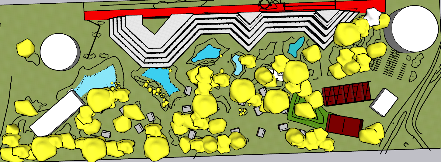 keep the shapes convert this image into an aerial view distinguish the yellow as vegetation mediterranean pines it is a space near the coast but the coast is not visible the red is the street change its color and make them asphalt keep the white roofs white and the maroon are tennis courts the white and round are facility buildings such as a shopping center the blue is water create a beach and pool environment always diffuse a ade vegetacion en cubiertas y balcones