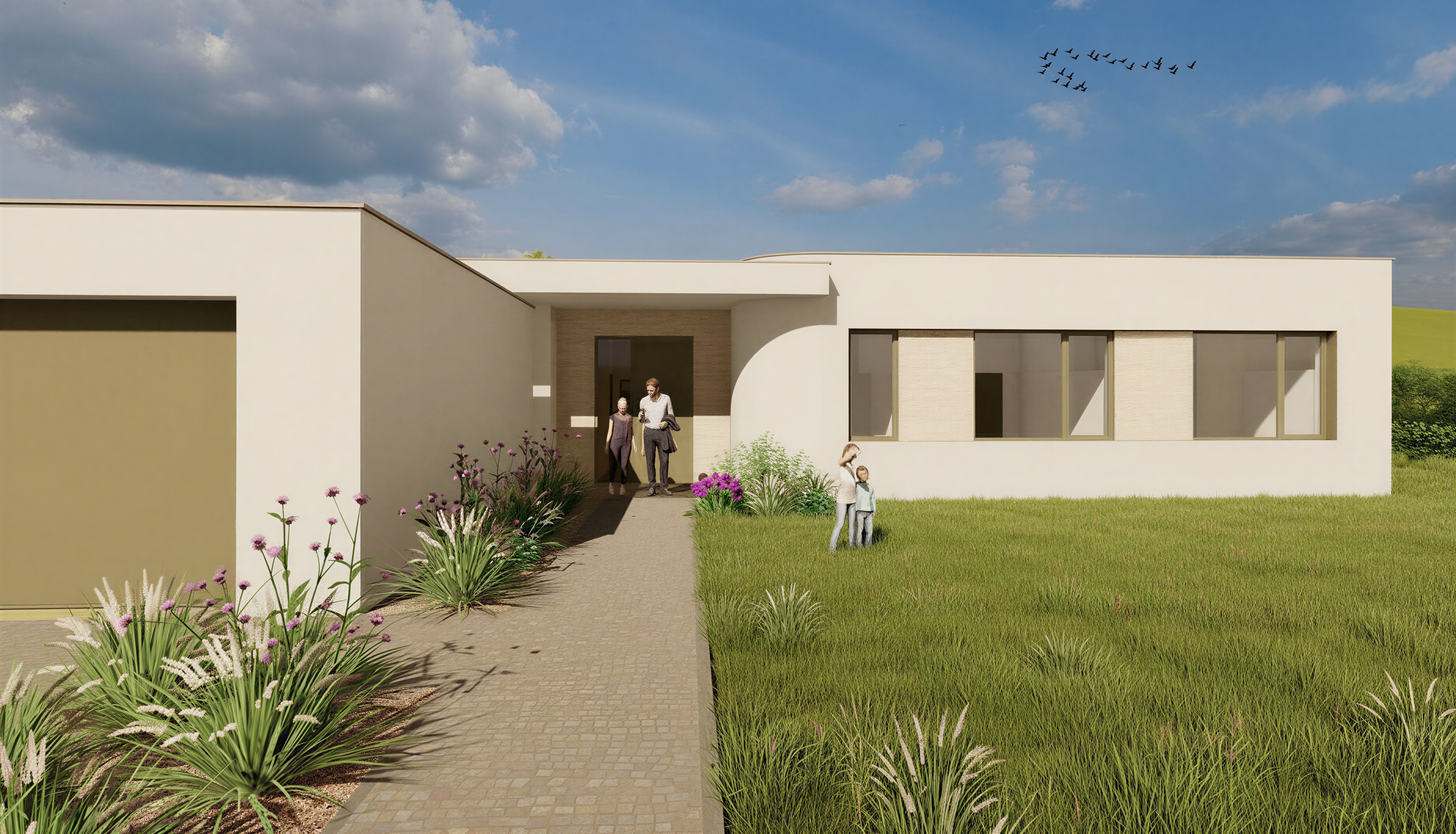 make the area between windows on the right using travertine keep the garage door in the same color and make it sectional