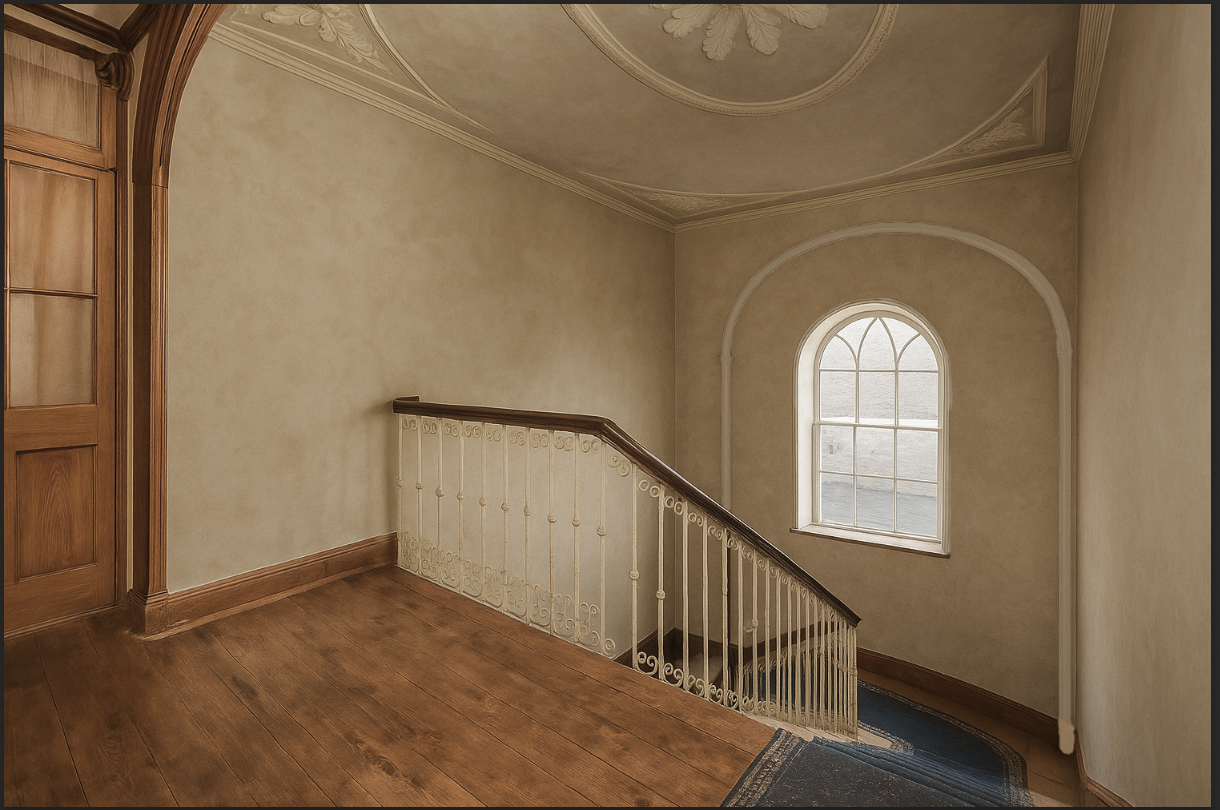 retain all elements of image but just remove the blue painted section of the stairs and replace with a silky ark gold toned rich coloured khaki stair runner stop it the runner at the top step it should not be visible on the landing paint the skirting board the same colour as the walls