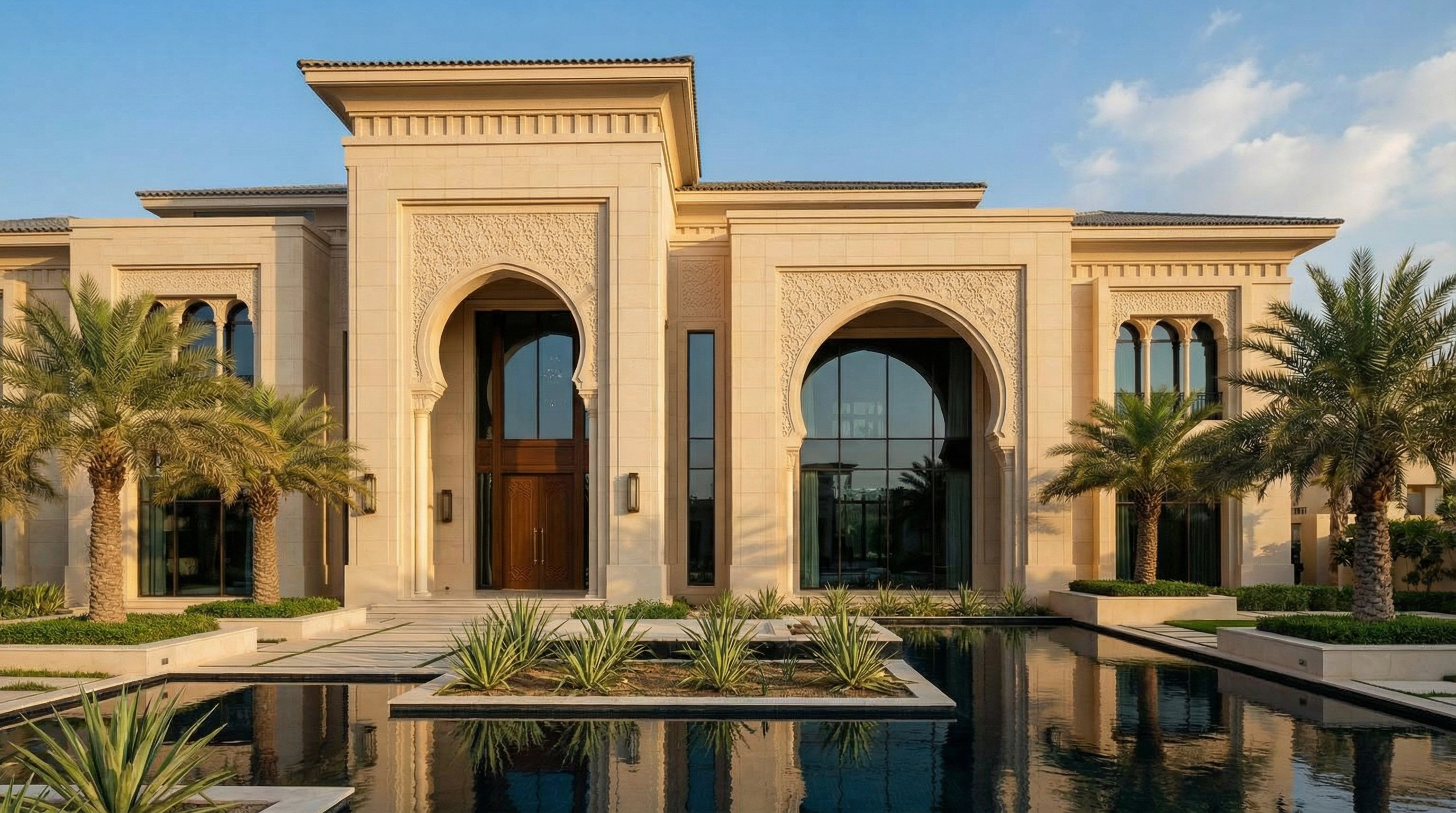 make it a moroccan villa style modern high quality render don t change in the mass make all opning full glass dont change in arches