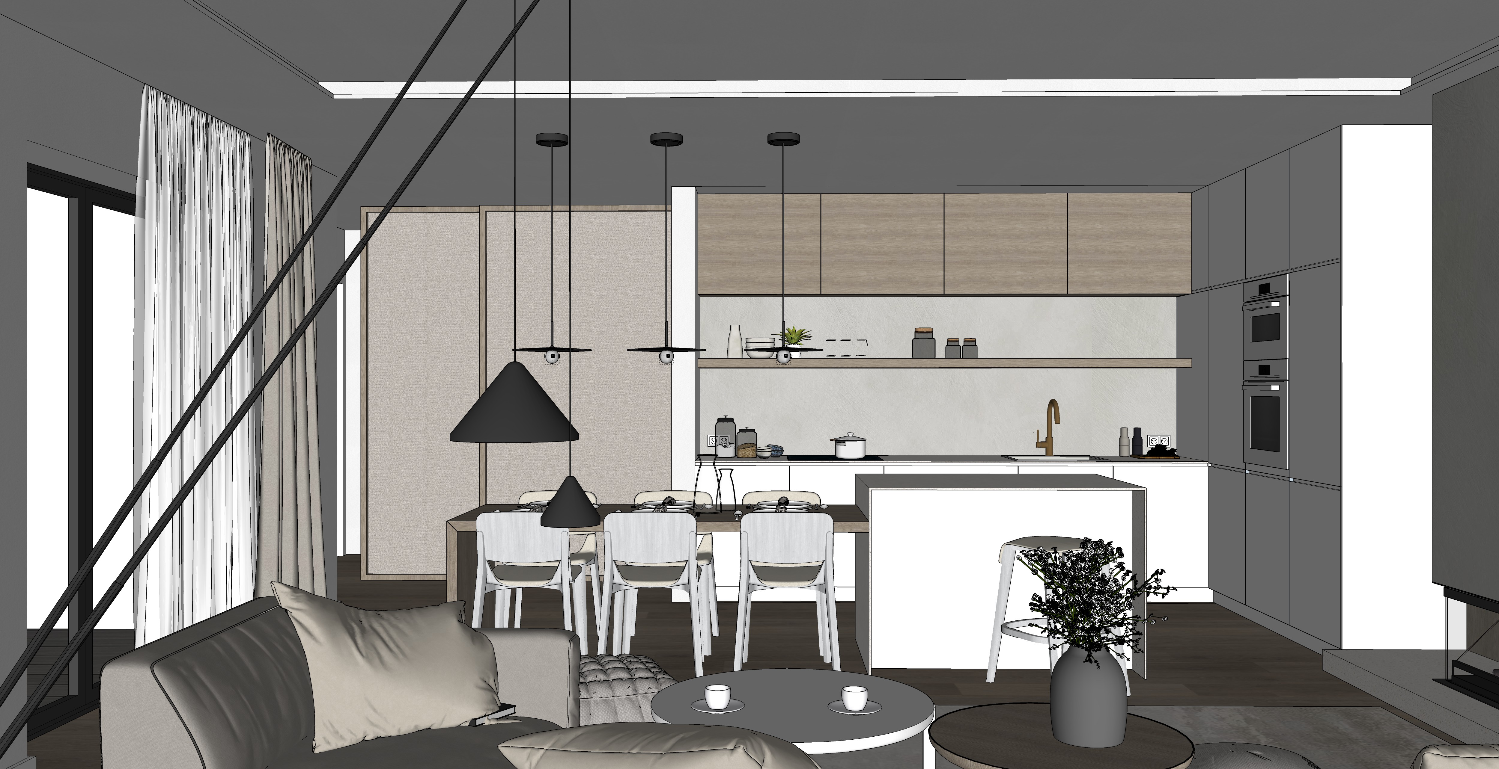 precise photorealistic interior soft light kitchen police backlit natural plaster light wood shelves in the kitchen shine down
