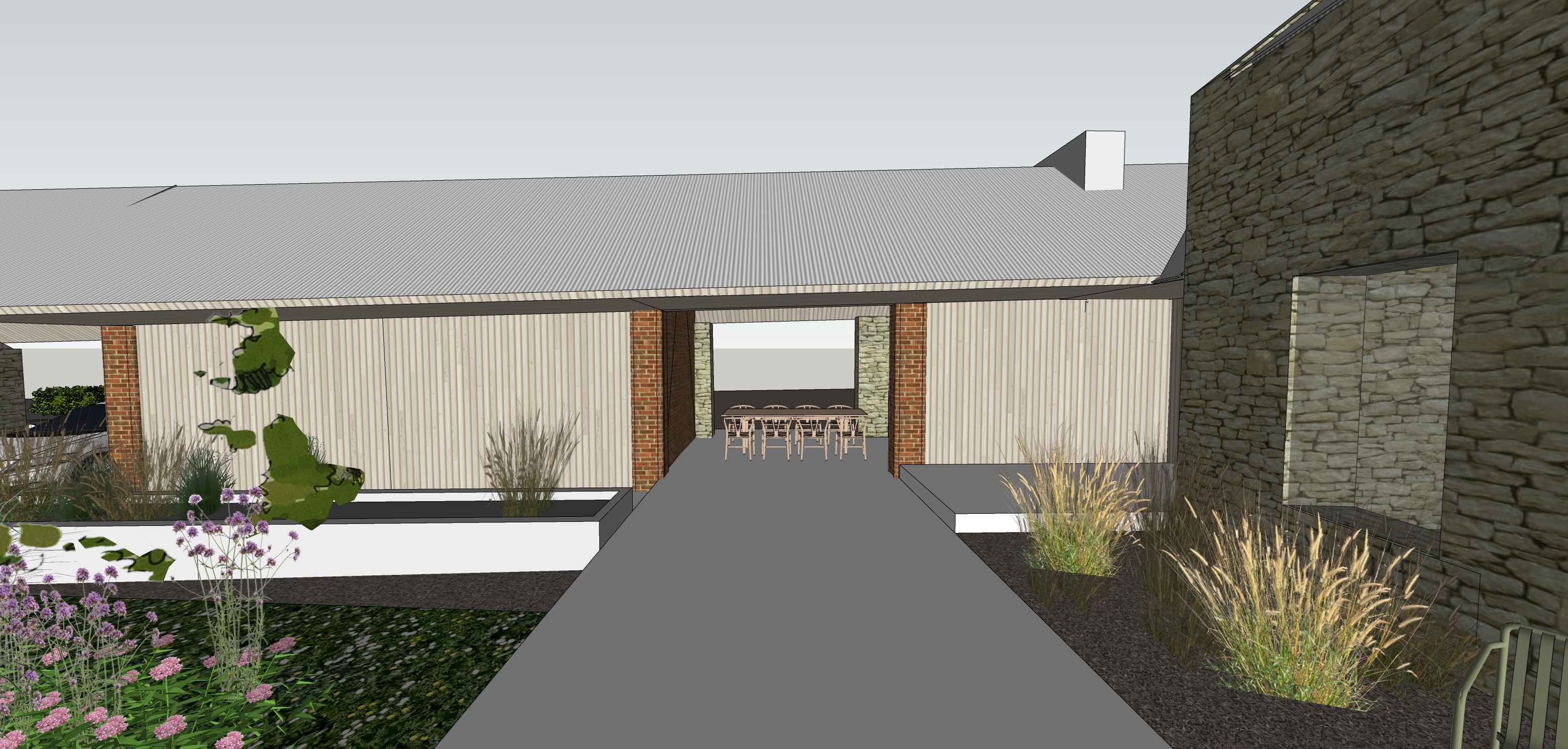create a serene atmospheric perspective render with soft diffused lighting and minimal reflection the whole image is very light with lots of natural daylight the image shows a modern rustic barn conversion with warm sandstone walls and a galvenised corrugated metal roof with rafters extending visible below the single storey barn has vertical timber fins with glazing between providing a glazed corridor looking onto the courtyard inside the lime bagged brick can be seen through the glazing the foreground is a lush courtyard garden with tall grasses native wildflowers and small trees with brick paving the overall atmosphere is a contemporary architectural conversion of rustic barns the quality of the image is ethereal with soft lighting and slight haze in the style of forbes massey