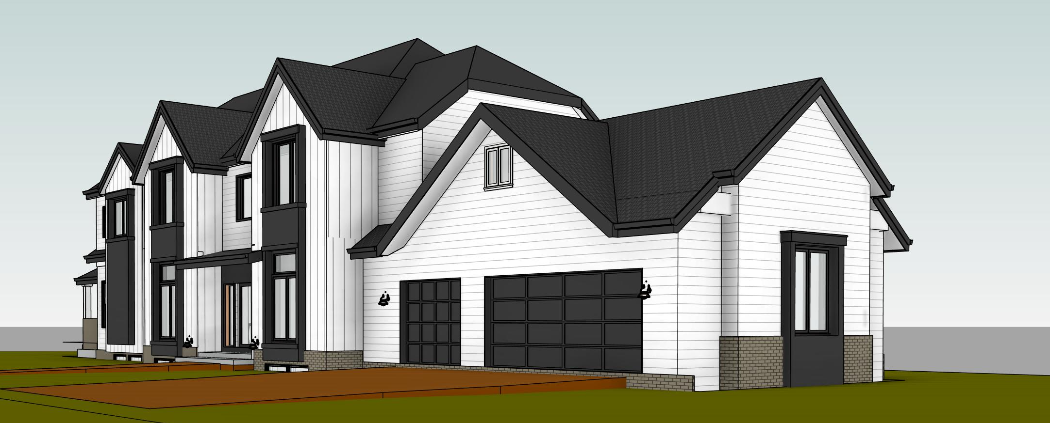 exterior shot modern farm house white siding black windows gray shingle roof blue sky with clouds green lawn premium lanscaping architecture