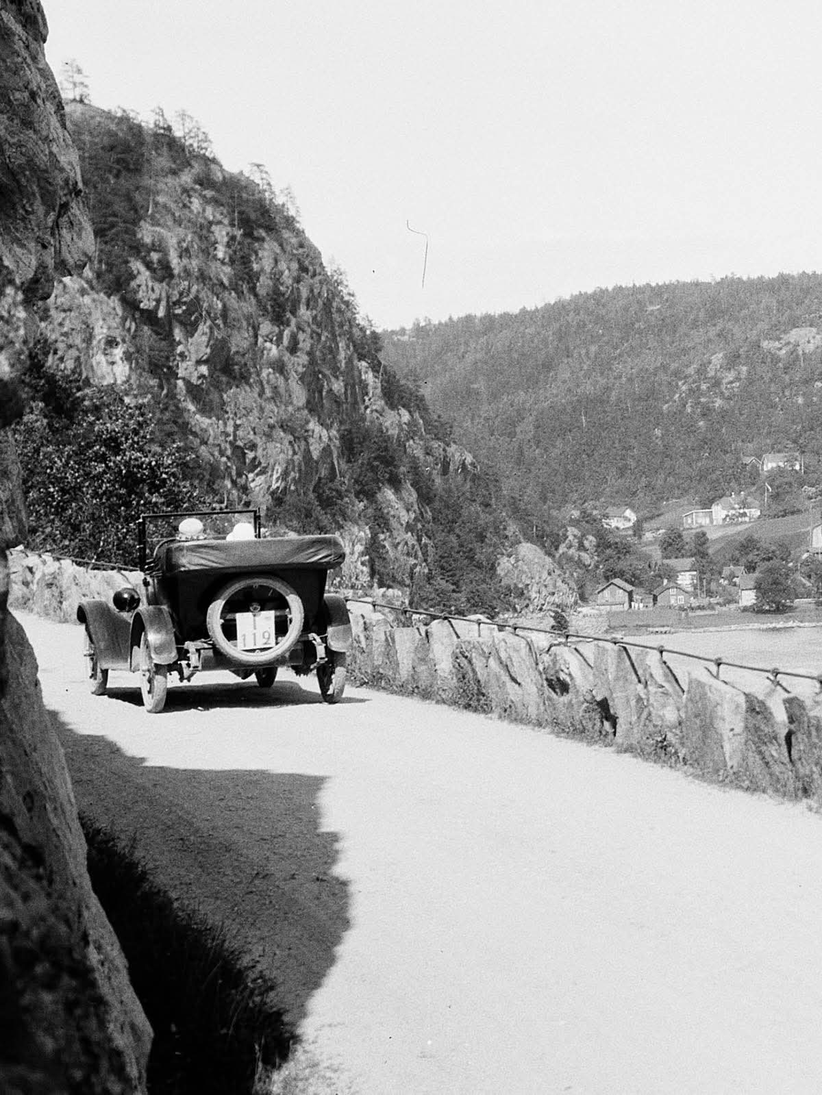 exterior shot put on colors this is an old picutre from 1920s its a car driving on a road with houses and forwst in the background keep the style as it is architecture