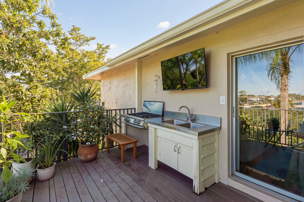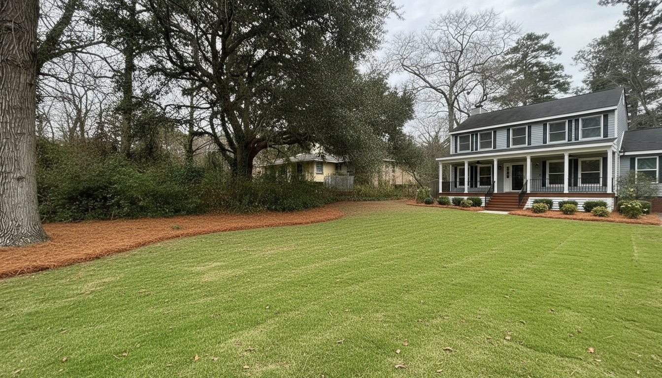 completely remove the brush and overgrowth between these houses clear sightlines to the neighboring lawn keep the pine bed inbetween