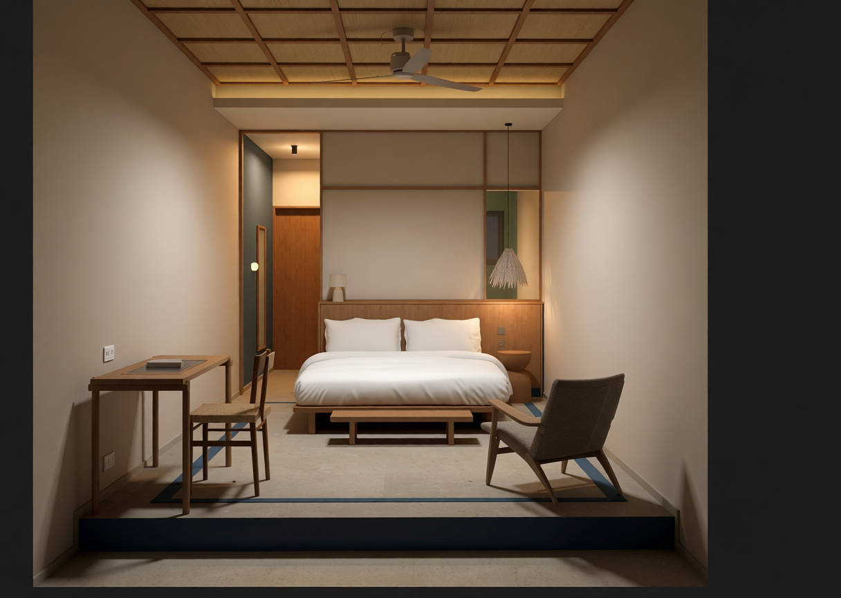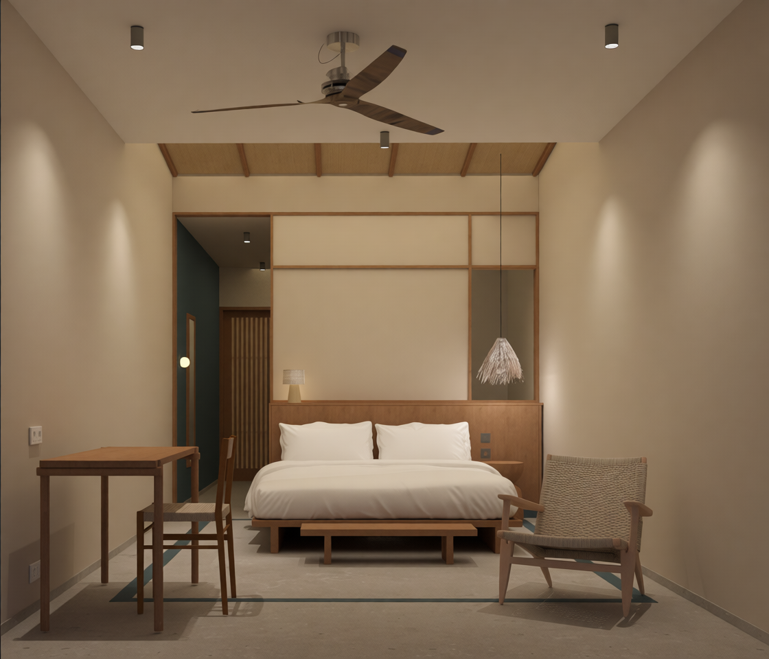 maintain the existing design exactly as it is do not add windows no changes to geometry layout materials furniture or colors introduce daylight coming the back of the observer the light should be diffused soft and realistic filling the room with gentle brightness and creating subtle shadows do not add windows or modify the wall structure in any way enhance realism through accurate light behavior global illumination and soft shadow transitions from the front artificial lighting can remain off or very subtle keep the existing atmosphere calm and natural no other changes to the scene preserve original design intent completely do not modify the room s structure