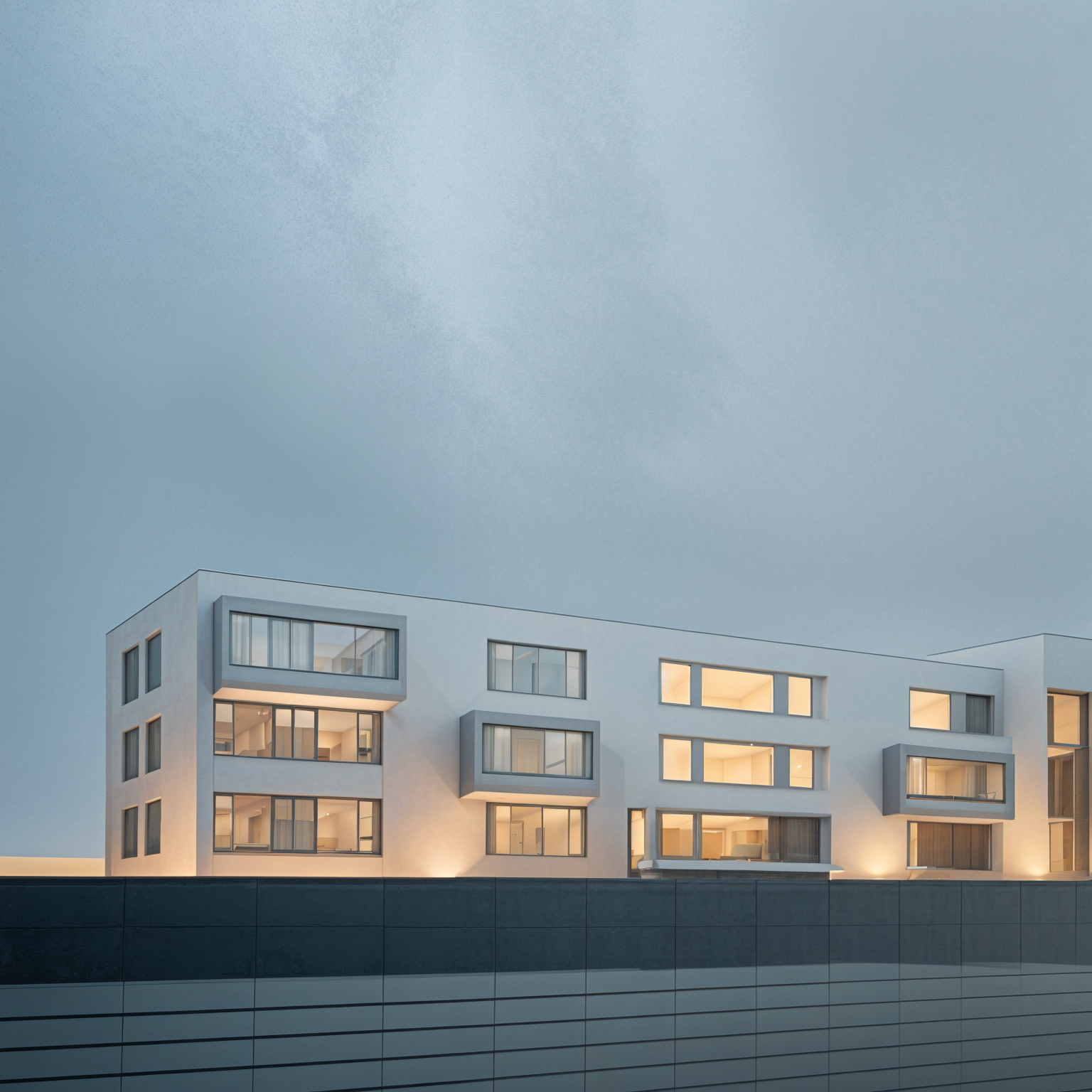 modernist exterior shot there s a light on in every window architecture