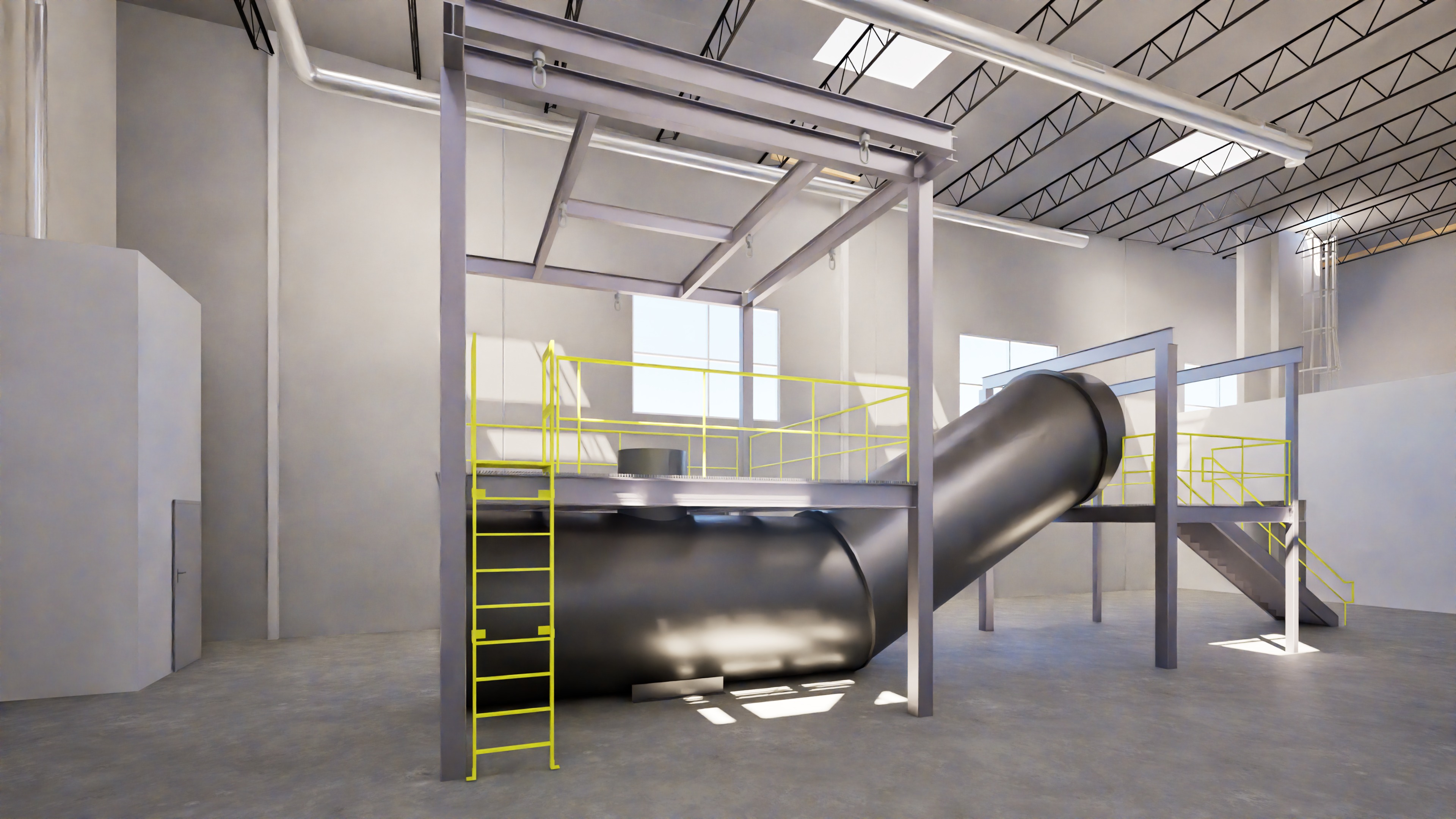photorealistic rendering of a public works training facility all brand new construction with semi reflective sealed concrete floors no grime no rust no mess add 4 6 maintenance workers with safety vests safety glasses and gloves add a knack box in the background on the left side maintain the yellow railings and ladder where they occur add industrial white insulation to the underside of the roof the ducts overhead are a dull silver color the large dark pipe in the middle of the image is a dark steel pipe make it look photorealistic and add some bolts only on the flanges