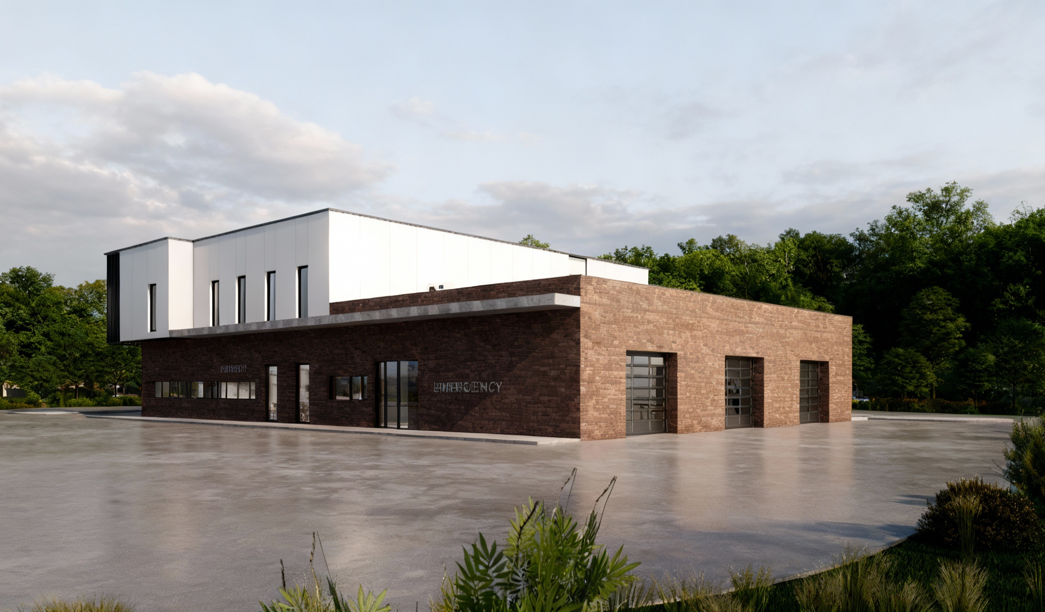 modern sleek mood clouds in the back lots of trees and greenery keep the pavement the same keep the signs on the fascade the same the fascade is light make reflections in the windows preserve all existing text on signs and surfaces the forest is in the background the lower fa ade is danish brick the upper part has slightly shiny light not pure white but slightly off white aluminum panels the entrance canopy and the overhang around it are exposed concrete light gray in color