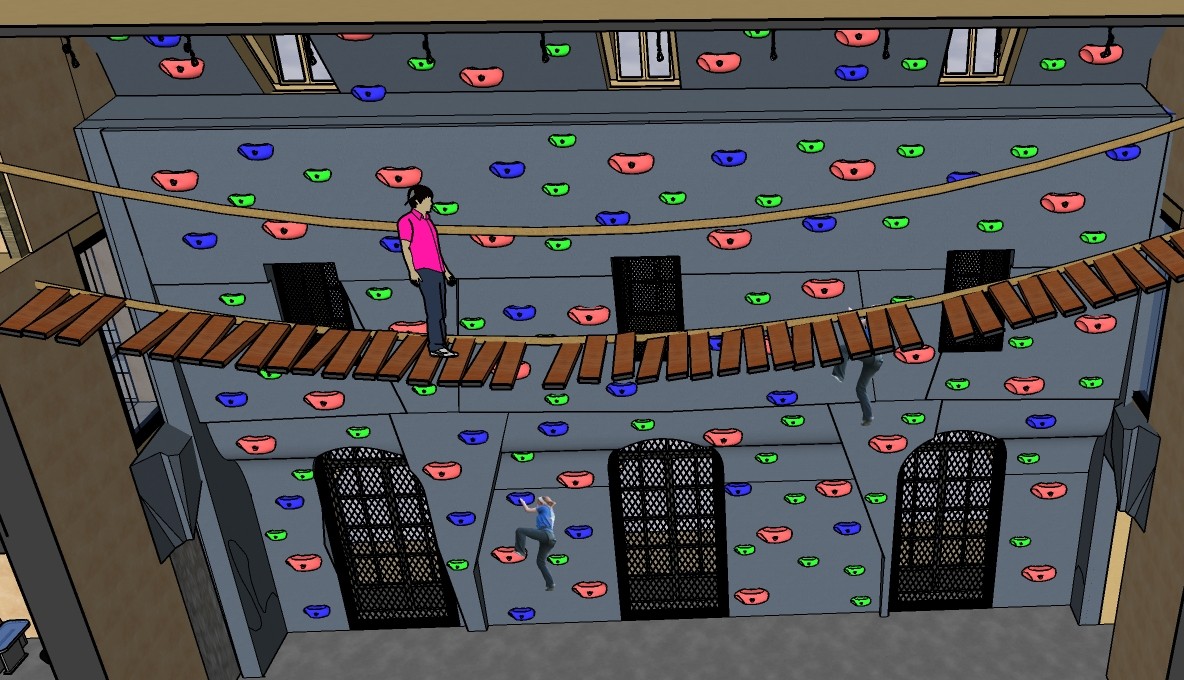 interior shot realistic daytime rendering of an indoor climbing space with a monkey bridge a man is walking carefully on the monkey bridge above the ground keep all geometry layout and objects exactly as in the sketchup model do not move delete or add anything the climbing wall must have real climbing wall material with visible texture holds and realistic grip surface the floor should be covered with shock absorbing mats thick safety padding on the windows add a protective safety net not too dark slightly visible but allowing sunlight to pass through the scene should be lit by natural daylight streaming through the large windows with soft shadows and balanced contrast to make it realistic and immersive no artistic or stylized effects keep it clean detailed and photo realistic