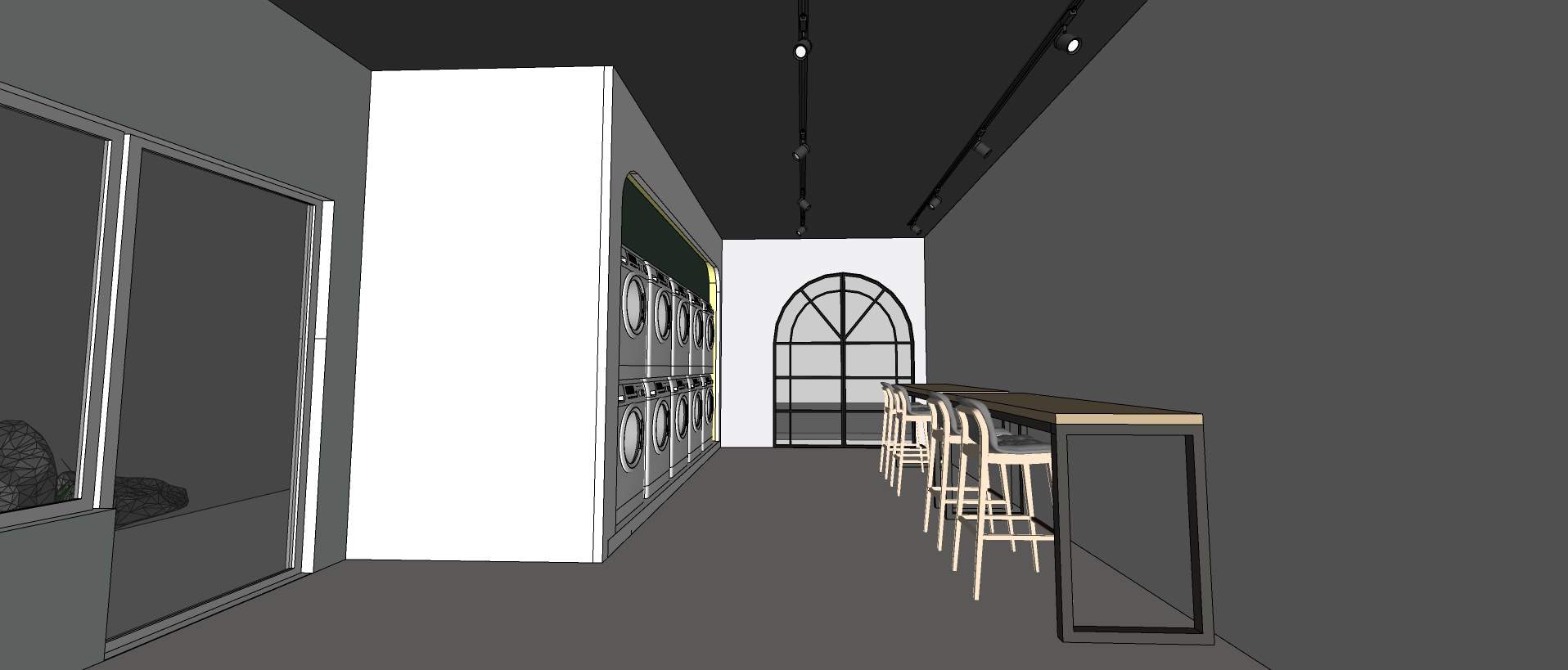 modernist interior shot light blue concept for this laundry shop with black granite finish 60x60 floor tiles black track lights architecture