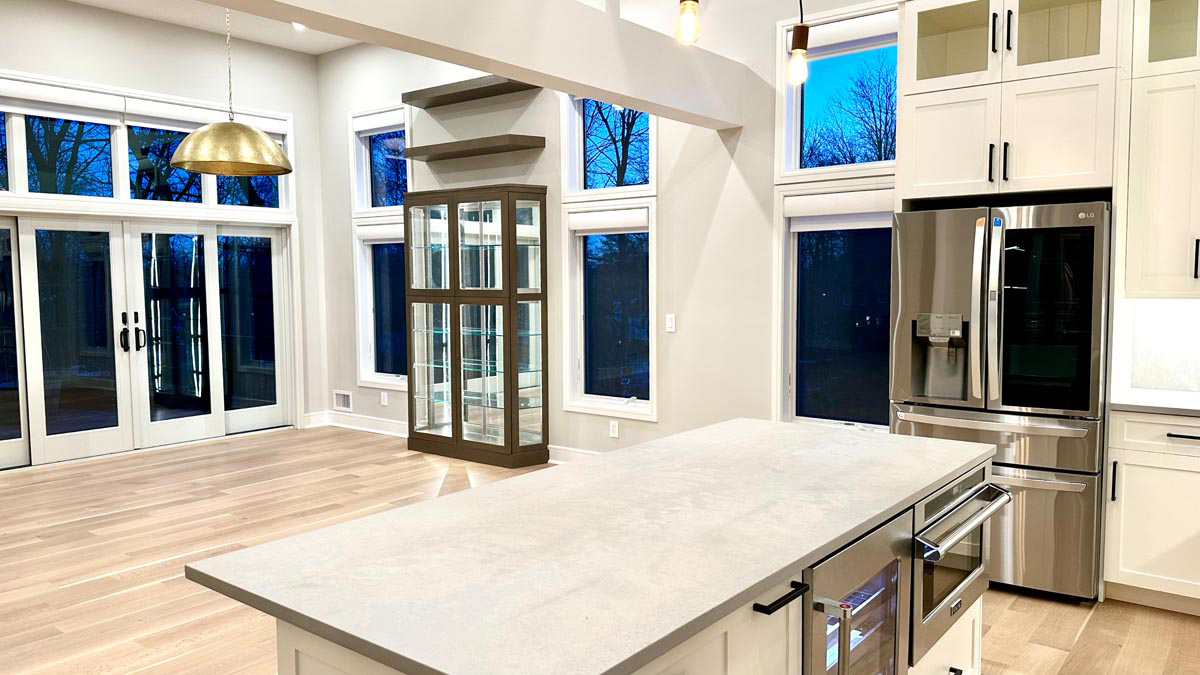 make it realistic with people at a dining room table eating and people standing in the kitchen with dishes on the island with flowers