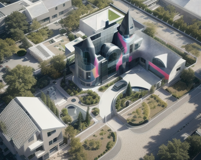 photorealistic architectural render based strictly on the provided image reduce size of the 10story building and the greenhouse place the greenhouse next to the building not next to the parking area maintain original lighting camera angle scale and architectural style do not add new buildings skylines or urban density