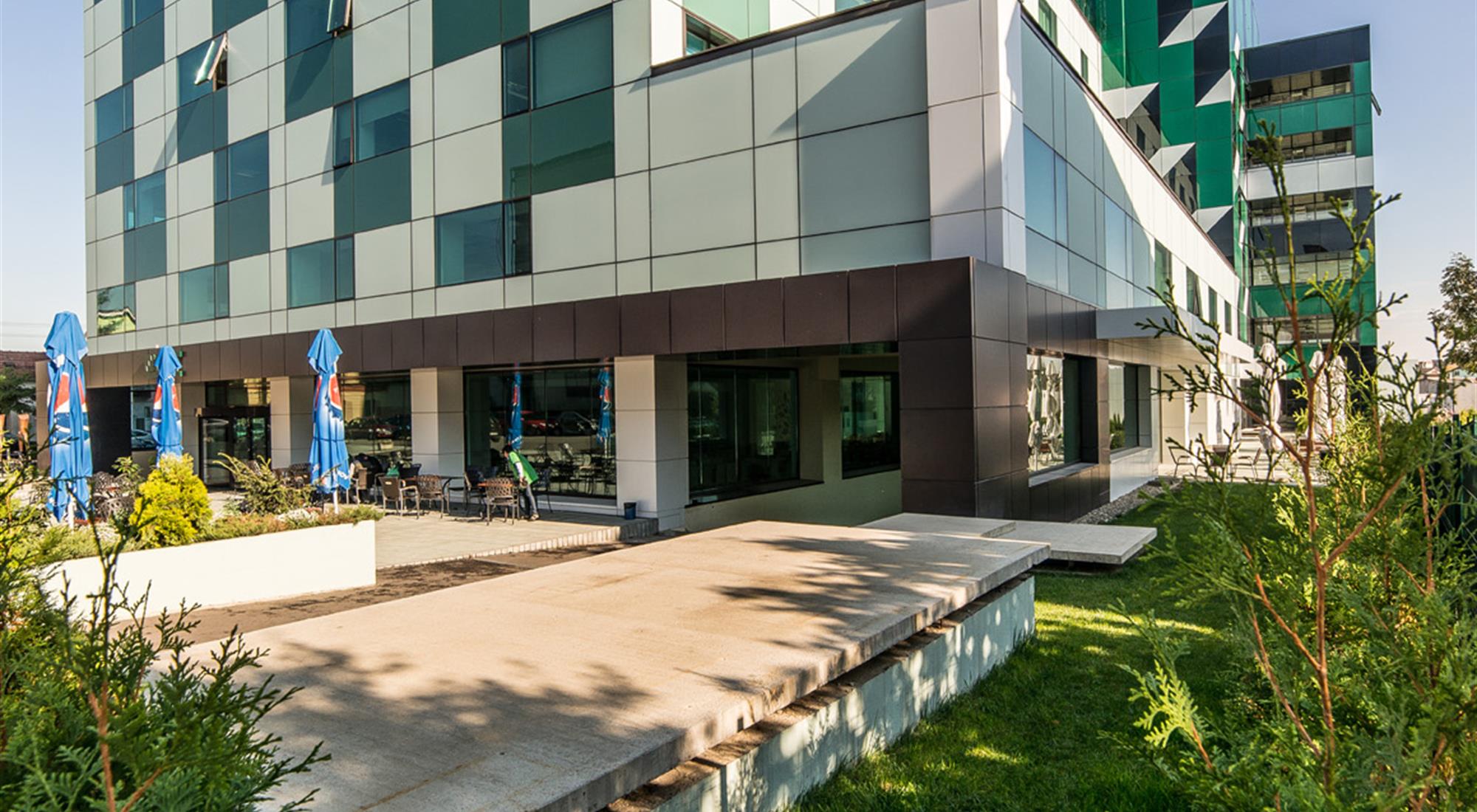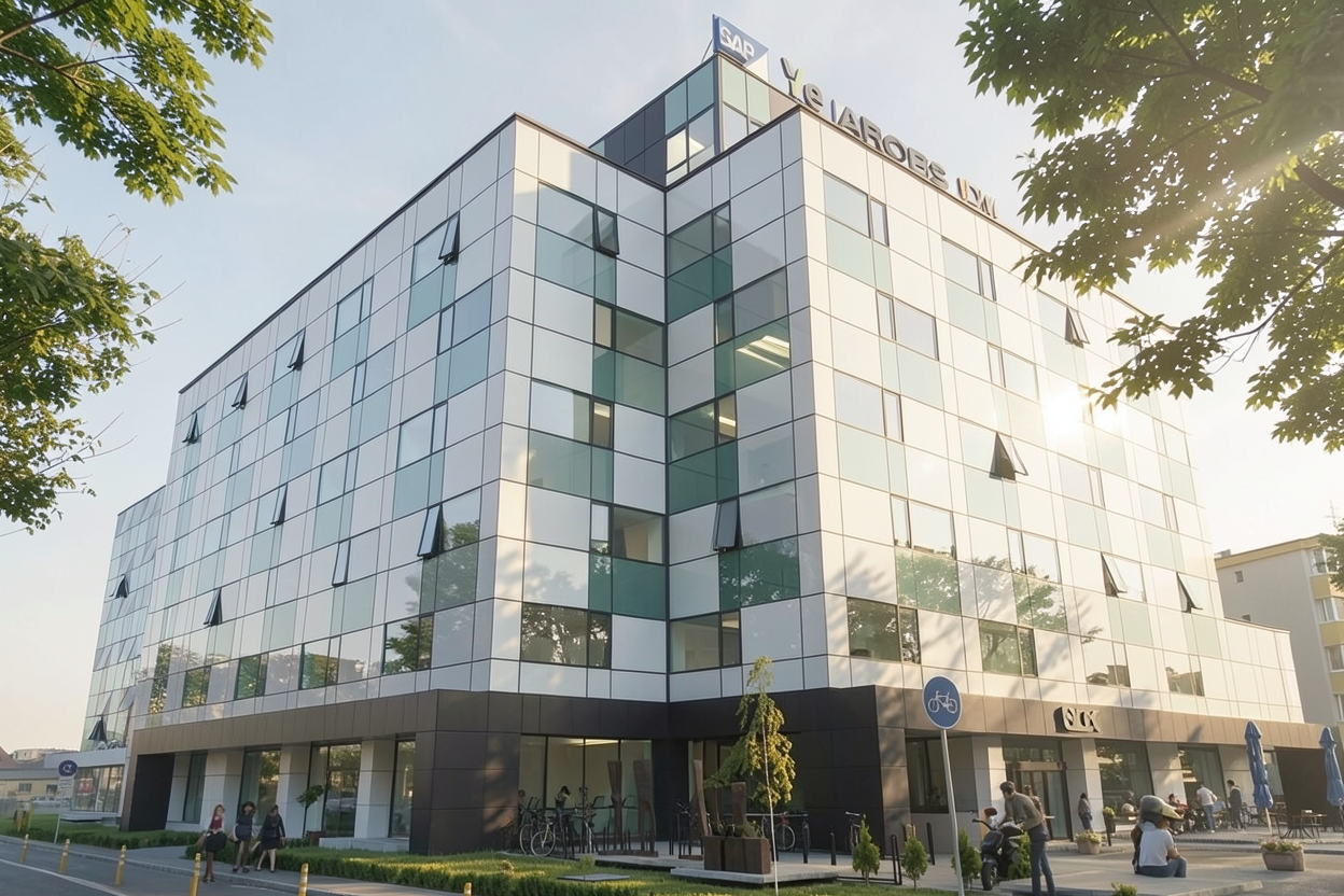 important preserve the existing geometry and the existing context exactly as provided do not modify alter reinterpret add remove scale or reshape any geometry do not change the site surroundings street layout neighboring buildings vegetation or context elements do not modify geometry scale proportions buildings road layout sidewalks or surrounding context in any way do not modify text soft late afternoon natural daylight neutral and diffused sunlight coming from the upper right subtle shadows slightly hazy summer atmosphere soft ambient subtle sky reflections in windows slightly reflective glazing with realistic fresnel effect soft motion blur on people for realism light breeze feeling in vegetation natural green tones sunlit tree leaves casting soft dappled shadows photorealistic exterior visualization balanced exposure no harsh highlights no overblown whites slightly warm white balance realistic asphalt reflections with mild roughness physically accurate light behavior high dynamic range but controlled keep contrast on the facade glass almost zero reflections