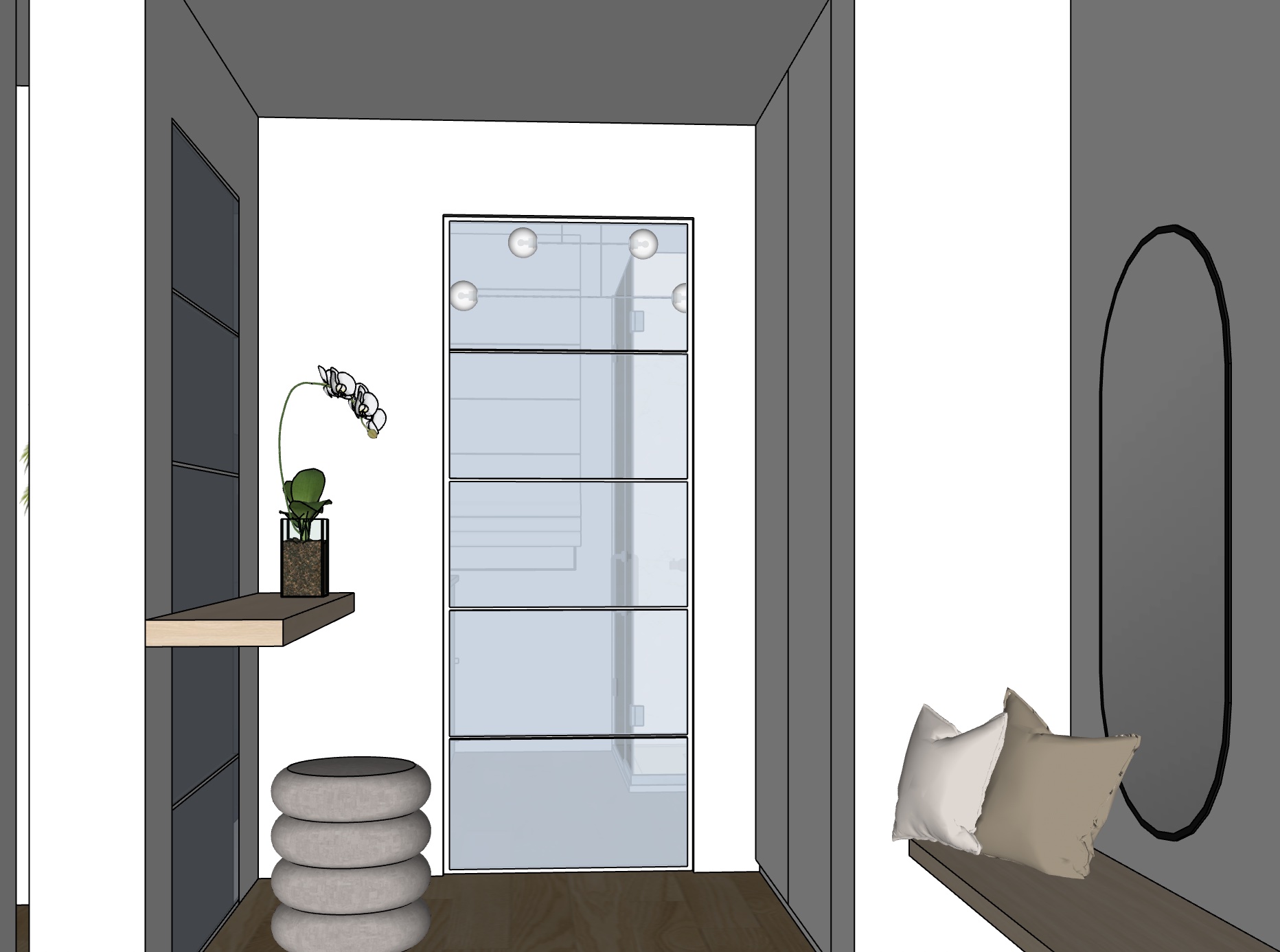 add recessed spotlights into the false ceiling and let some natural light filter through the two glass doors the glass must be opaque so that the bathroom cannot be seen the ceiling is painted white