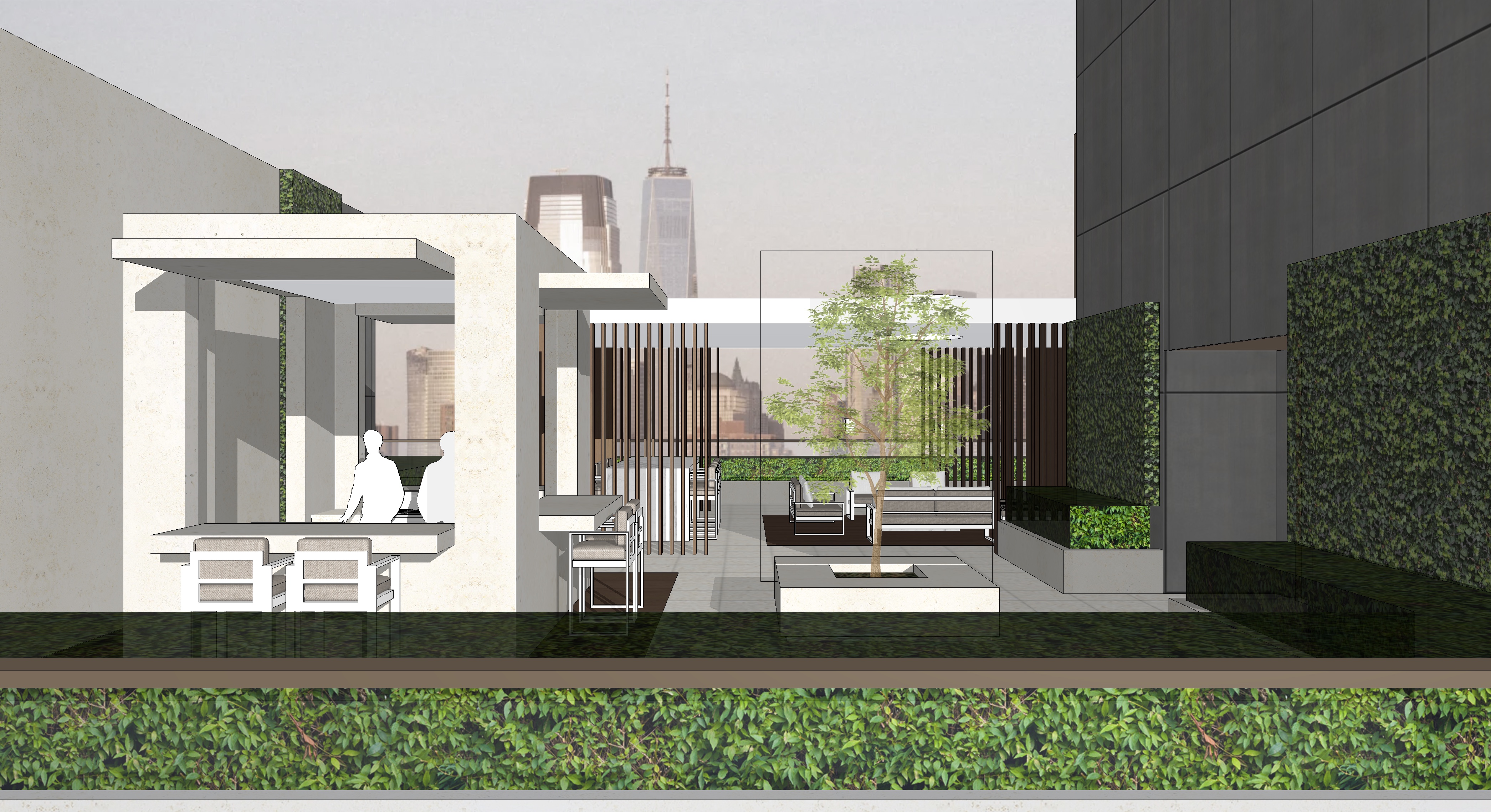 render a modern rooftop terrace with a sophisticated and serene atmosphere the background features a soft sepia skyline with a light gray sky clipped hedges in the planters around the edges incorporate sleek white and gray furniture ensure limestone elements have a honed beige finish include subtle natural shadows soft ambient lighting and a calm urban vibe realistic tree in planter no people no outline around tree