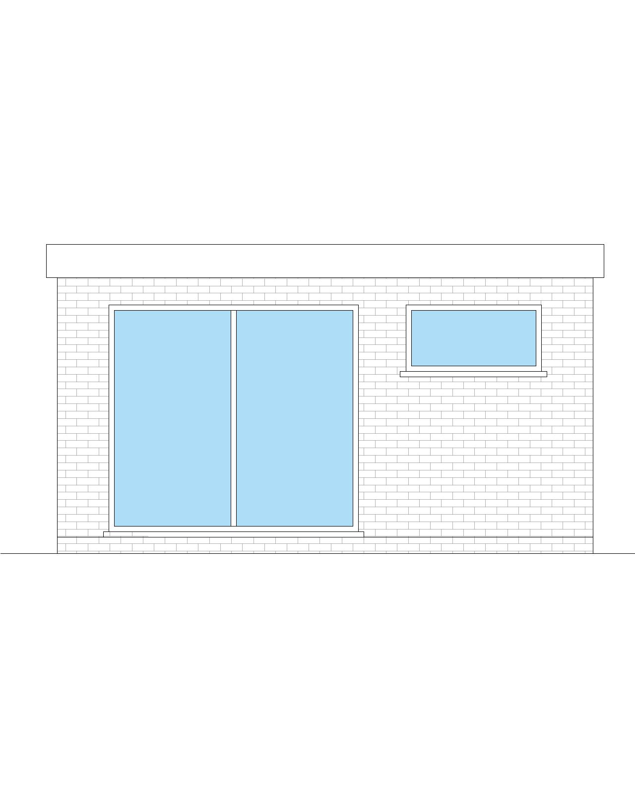modernist exterior shot modern minimalist building with a grey color flat roof large glass windows and horizontal brick pattern render the bricks in a soft ivory color add a smooth white concrete roof the large window is transparent reflecting a serene blue sky the smaller window on the side echoes the same transparency surround the building with lush green grass the setting is a clear sunny day with soft shadows creating a calm and inviting atmosphere architecture