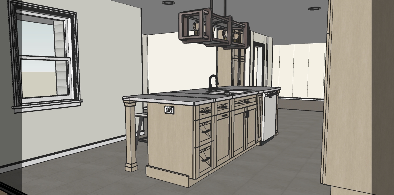 white quartz countertops blonde maple cabinets antique hardware on cabinets aged brass faucet plaster colored luxury vinyl tile in 12x24 in a brick pattern on the floor snowbound by sherwin williams on the walls the chandelier over the island is a bronze black color