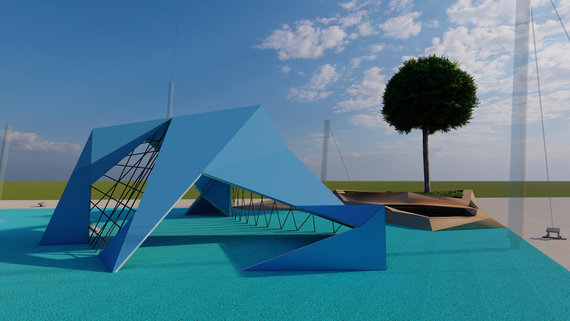 convert this image into a professional real life architectural photo of the exact same design keep the structure identical with no geometry changes same canopy angles same supports same glass pattern same proportions and camera viewpoint replace the artificial cgi look with real material realism and natural light behavior use natural sunlight hdr reflections realistic color grading slight lens distortion subtle bloom physically correct shadows add realistic material texture matte powder coated steel glass reflections slight dust and mild weathering realistic rubber flooring texture place the structure within a real public park setting to provide context landscaped greenery trimmed lawns subtle pathways and distant trees do not change the building footprint or camera angle add children actively playing and interacting naturally with the space climbing running sitting leaning pointing laughing using the structure as a shaded activity play zone include 4 8 kids of different ages approx 4 12 years old with casual park clothing and natural motion blur where appropriate keep the kids secondary in focus architecture remains the hero add realistic depth of field and atmospheric perspective extremely realistic architectural photography high end competition render documentary style realism