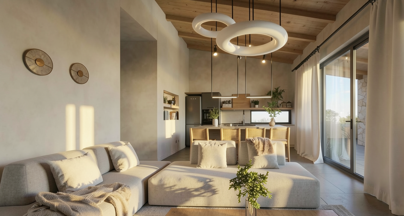 create a realistic image add 2 3 small birds in the sky ad 2 children in a front of the garage ad a women in the frontyard