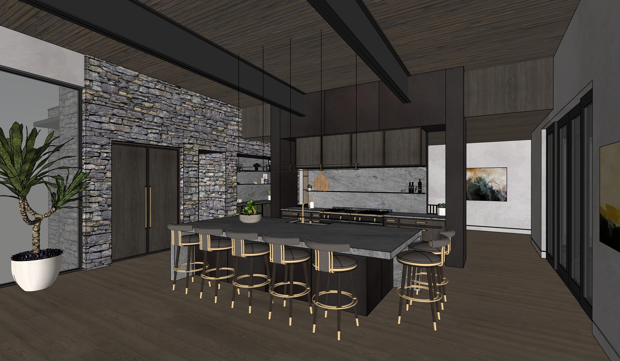 do not remove or change any geometry in image rough hewn tennessee fieldstone stained straight grain white oak tongue and groove ceiling dark metal window frames cold rolled steel beams steel wall panels around kitchen range wall soapstone countertops and backsplash at range wall and shelving beyond dark stained walnut wall paneling above range dark stained walnut cabinetry above cabinets light coming from chandelier above island smooth finished stucco walls sparse native plants outside evening light with shafts of light