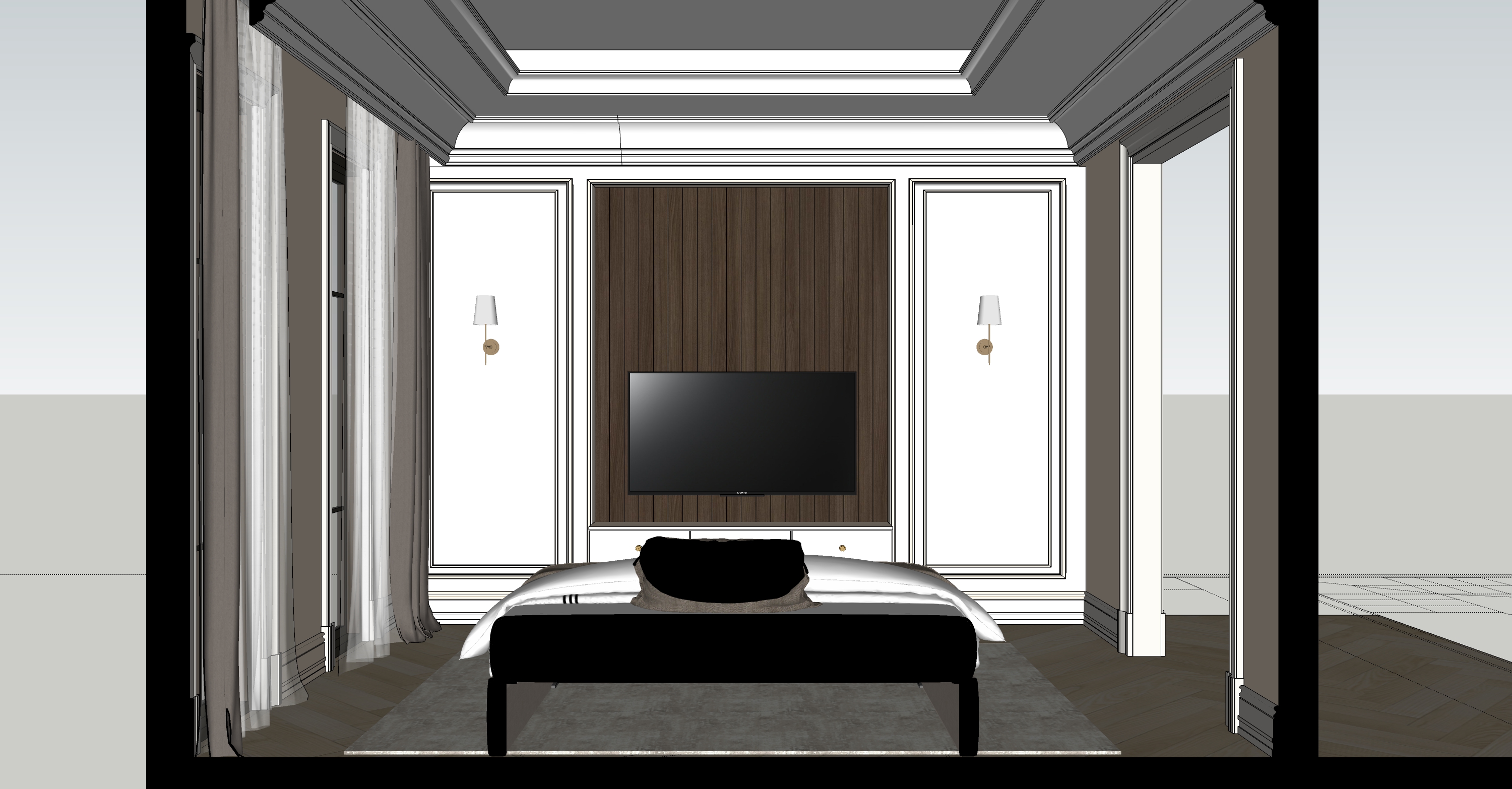 render senyata mungkin tambah indirect light di plafon dan headboard dan cove gorden warna panel tv kayu coklat lantai vinyl coklat terang ambien render off white terang