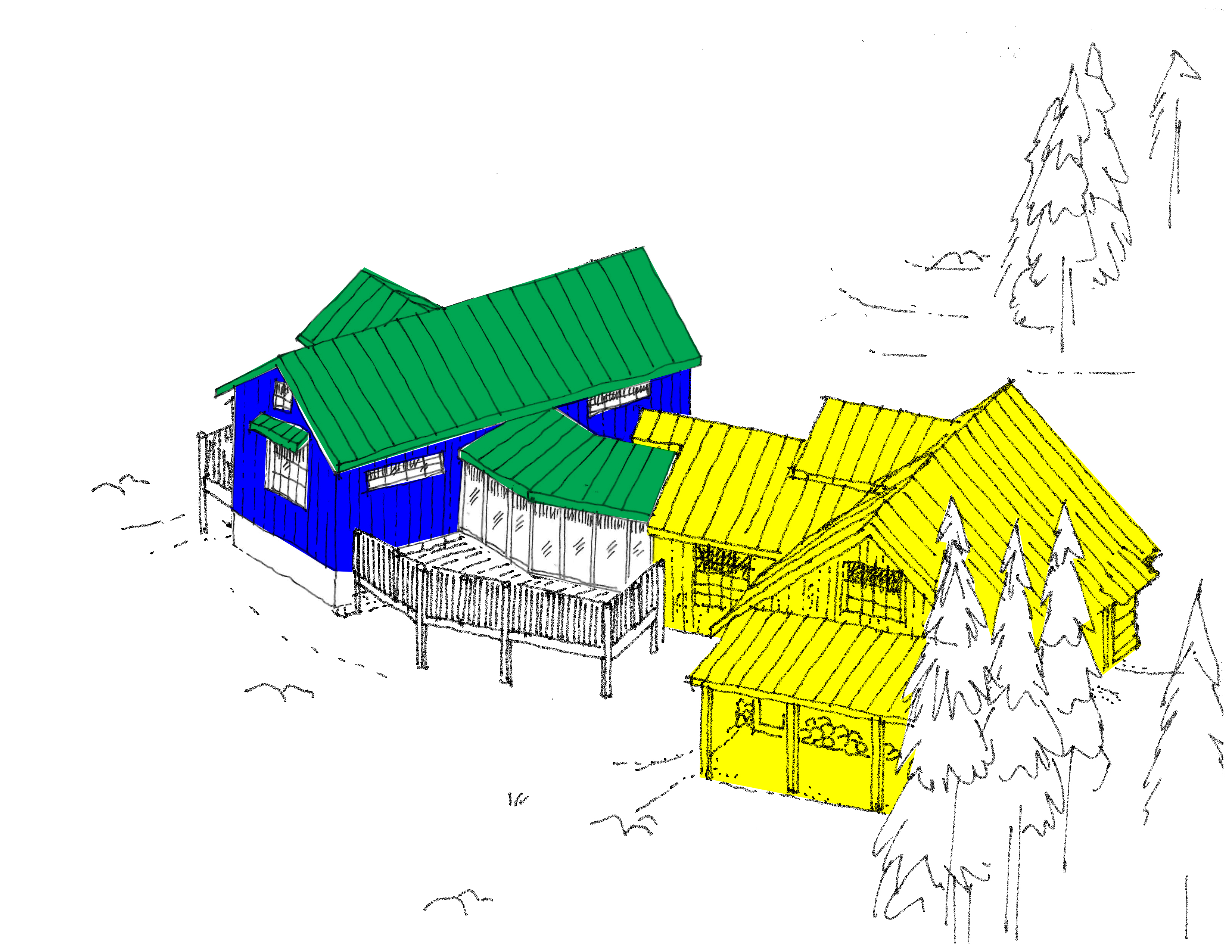 color exterior rendering same point of view as sketch yellow area to match ref 2 image blue area to match ref 3 siding green roof to match ref 2 roof south dakota forest with pines wood deck