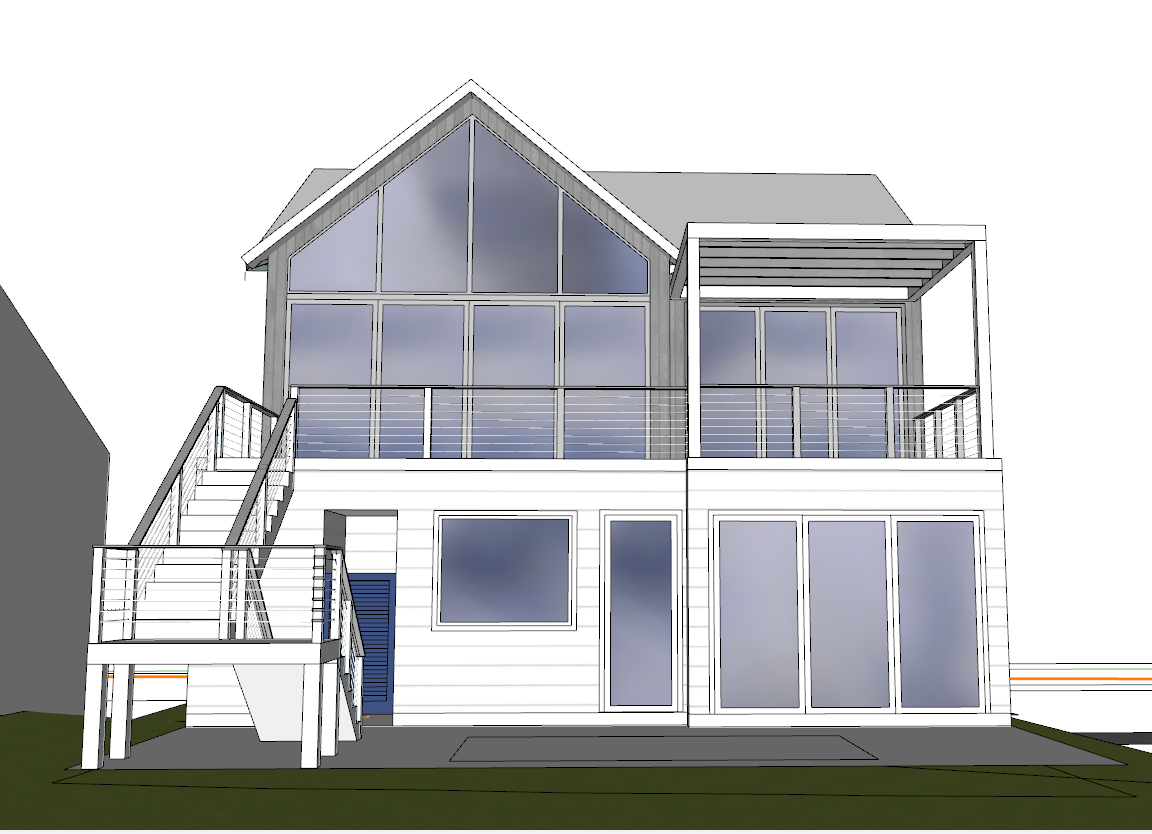 render a modern two story house with large glass windows and a symmetrical design use a crisp white for the exterior walls soft blue reflections for the glass and light gray for the roof highlight the metal railings with a sleek silver finish set the scene in a tranquil dusk atmosphere with a twilight sky painted in gradients of purple and orange the surrounding greenery should be lush and vibrant creating a serene and inviting mood
