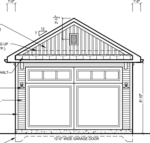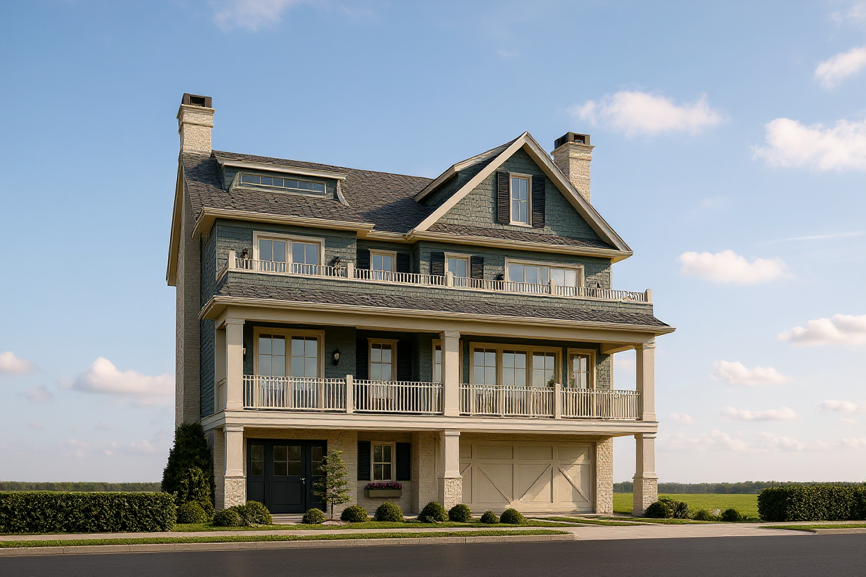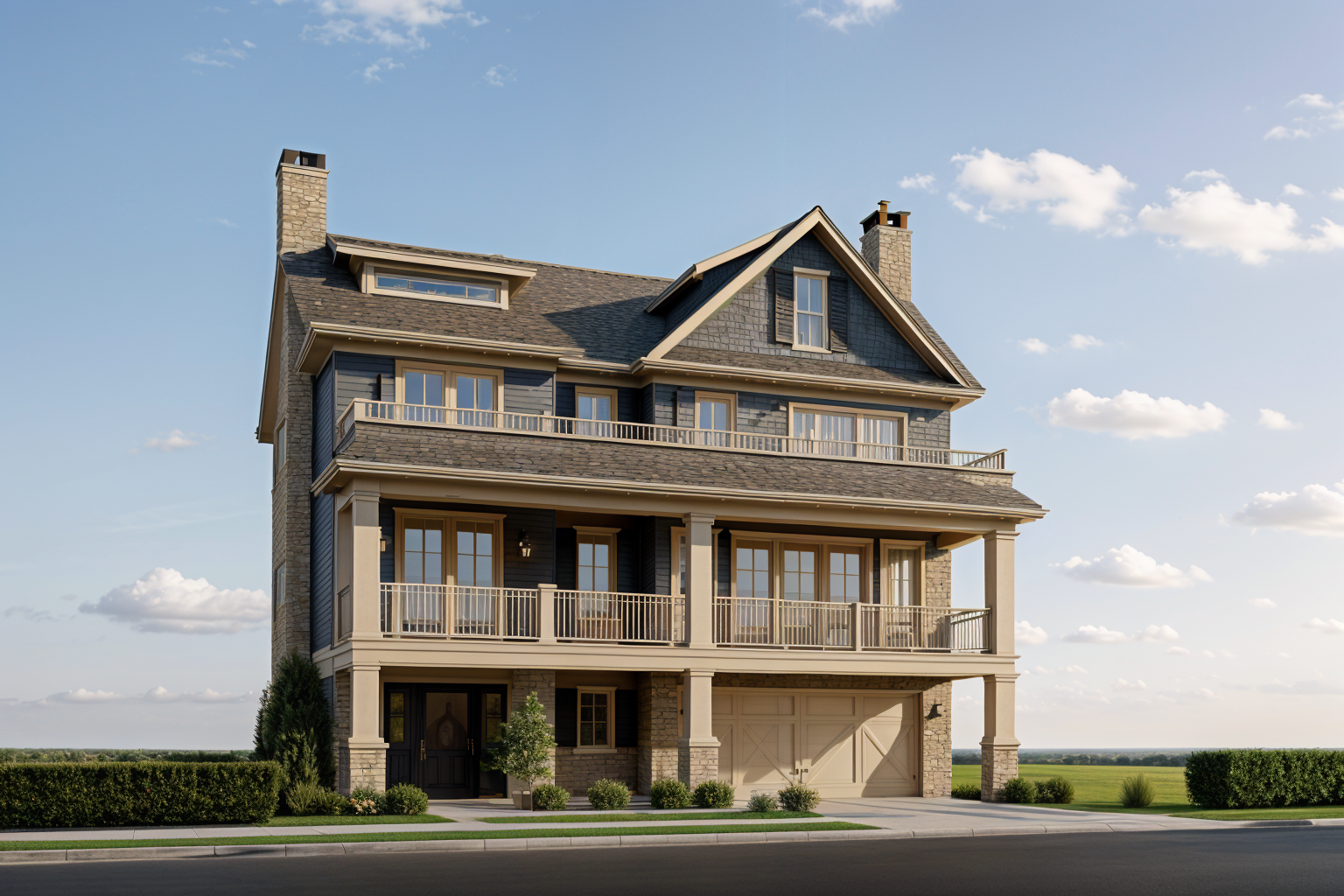 make this elevation into a rendering the top is white board an battton and the bottom is white horizontal siding the garage door is black and roof is asphalt shingle