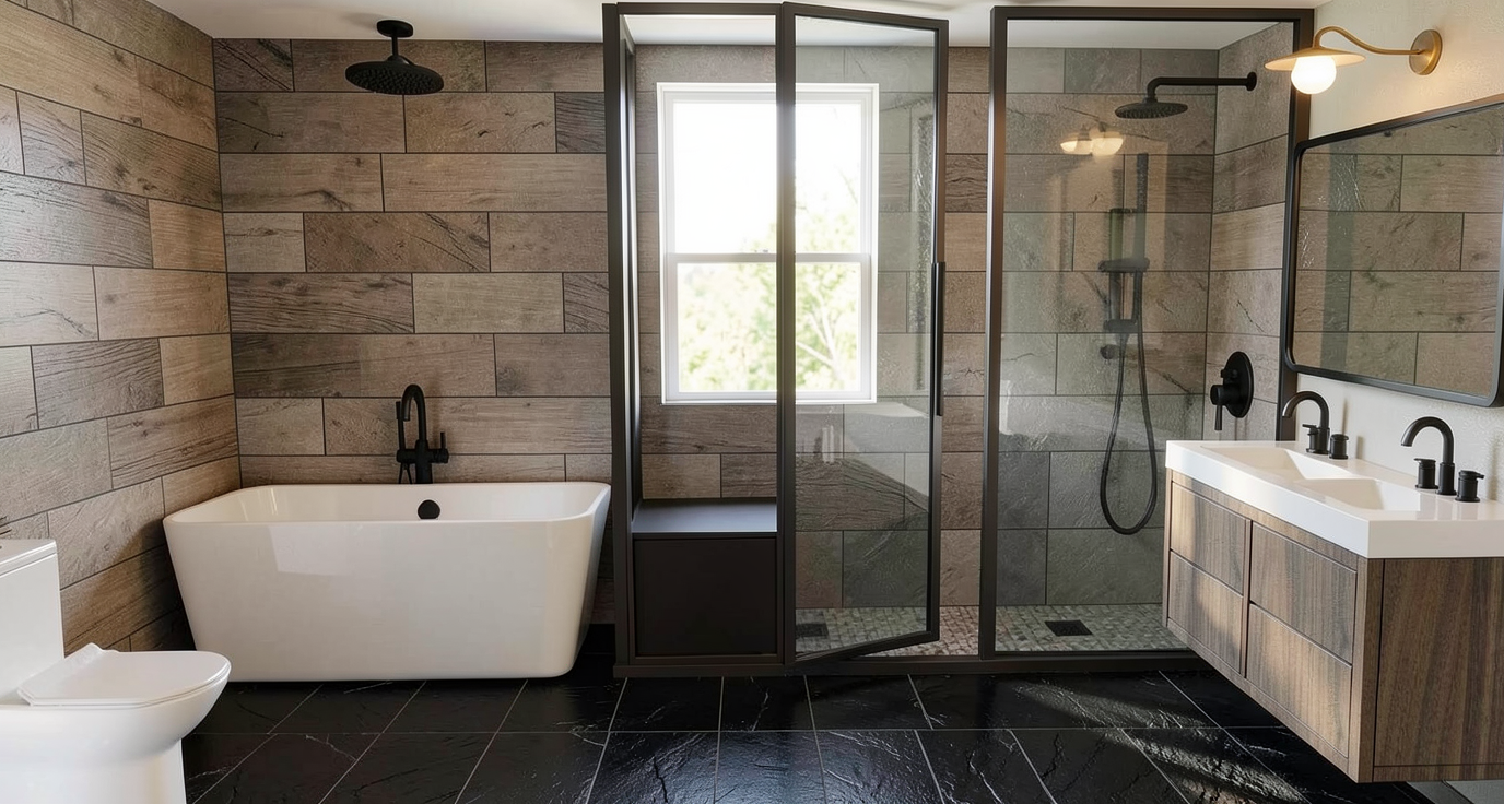 horizontal light wood shiplap black stone floor tile shower