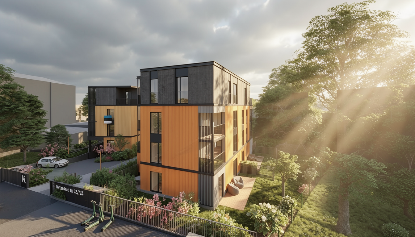 photorealistic render with no background soft light three main materials according to current monocromatic colors dark grey is dark grey metal cladding medium gray is gray wood cladding lighter grey is grayish limestone wall window frames anthracite gray