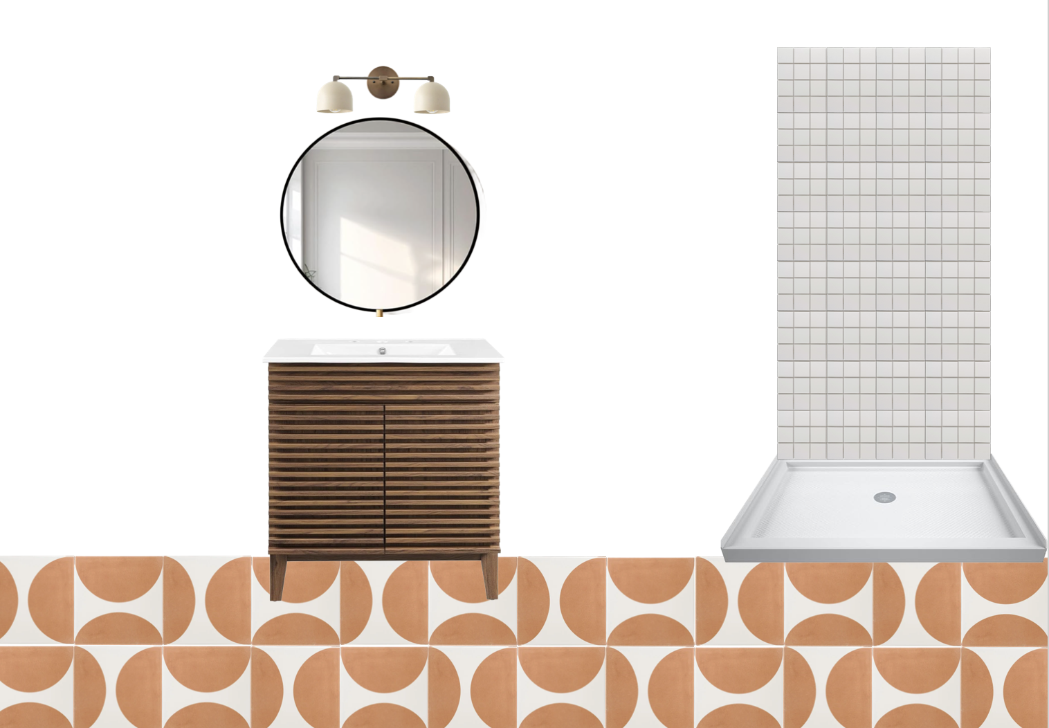 this is a pool room bathroom the pan is a shower pan make the tile go all the way around the pan left right and back wall add a glass door