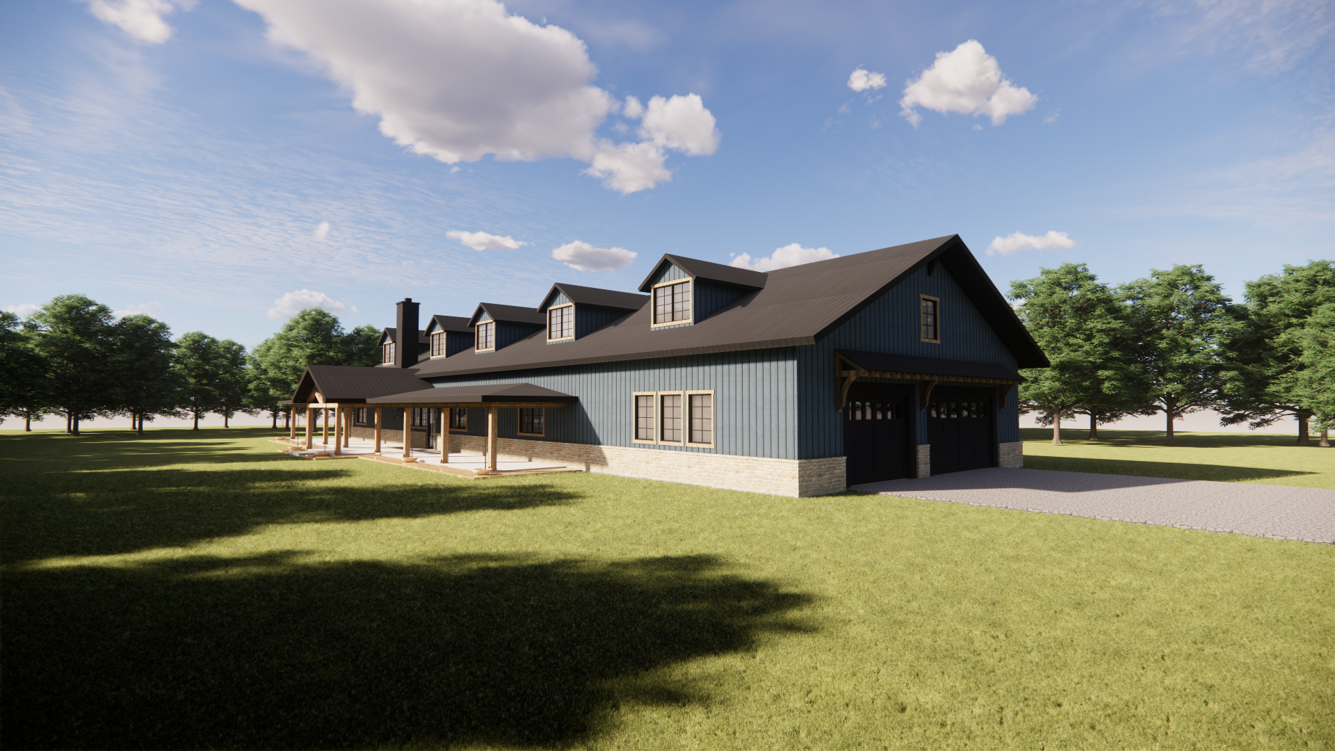 photorealistic architectural rendering of a large modern ranch style barn house located in weatherford texas maintain the exact building geometry rooflines dormers porch layout column spacing and massing exactly as modeled do not modify the architecture proportions or layout exterior materials exterior walls clad in deep blue standing seam metal wall panels matte finish with crisp vertical seams and subtle metal reflectivity panels should appear as real architectural metal siding with straight seams and natural shadow depth roof finished in matte black standing seam metal roofing the roof color must be solid black metal not blue and not gray standing seam roof panels must be perfectly straight rigid and evenly spaced running from ridge to eave with parallel seam lines and consistent spacing 16 18 inch panels roof planes should appear perfectly flat and planar with no warping rippling bending or distorted seam lines the roof should look like professionally installed standing seam metal roofing panels with crisp mechanical seams and clean straight panel alignment porch columns beams trim and gable accents made from warm natural cedar wood rich amber brown tone with visible wood grain and natural variation base of the building clad in dark texas ranch moss rock stone veneer large irregular fieldstones with deeper brown charcoal gray and weathered tan tones stones should appear rugged and dimensional with deep recessed mortar joints and strong shadow lines typical of heavy ranch style moss rock construction in north texas avoid light cream or pale limestone tones windows with dark bronze or black frames rendering quality ultra realistic architectural visualization using physically accurate materials high resolution textures global illumination realistic reflections and natural shadows professional architectural photography style using a 35 50mm architectural lens environment and site set in rural parker county weatherford texas terrain with gently rolling ground native grasses limestone soil tones and scattered live oak and post oak trees natural ranch landscape with minimal landscaping and realistic ground textures lighting warm late afternoon texas sunlight with soft shadows under the porch and balanced sky exposure material realism materials must appear highly tactile and realistic visible cedar grain rugged dark moss rock stone with deep shadow lines and crisp metal standing seam panels important clarification the walls are blue standing seam metal while the roof is matte black standing seam metal roofing the roof seams must be perfectly straight evenly spaced and parallel with no warping or waviness and the roof surfaces must appear flat and planar like real metal roofing panels surfaces should look like real construction materials on a completed ranch house in texas not cgi